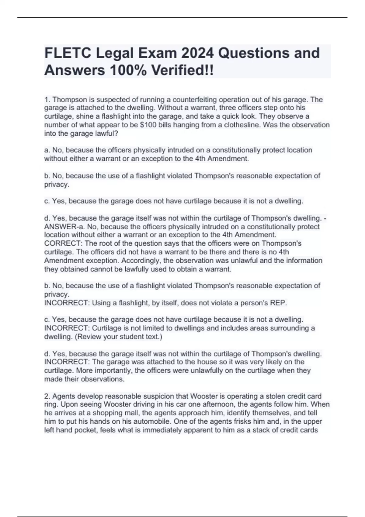 1. Thompson is suspected of running a counterfeiting operation out of his garage. The garage is attached to the dwelling. Without a warrant, three officers step onto his curtilage, shine a flashlight into the garage, and take a quick look. They observe a number of what appear to be $100 bills hanging from a clothesline. Was the observation into the garage lawful? a. No, because the officers physically intruded on a constitutionally protect location without either a warrant or an exception to the 4th Amendment. b. No, because the use of a flashlight violated Thompson's reasonable expectation of privacy. c. Yes, because the garage does not have curtilage because it is not a dwelling. d. Yes, because the garage itself was not within the curtilage of Thompson's dwelling. - ANSWER-a. No, because the officers physically intruded on a constitutionally protect location without either a warrant or an exception to the 4th Amendment. CORRECT: The root of the question says that the officers were on Thompson's curtilage. The officers did not have a warrant to be there and there is no 4th Amendment exception. Accordingly, the observation was unlawful and the information they obtained cannot be lawfully used to obtain a warrant. b. No, because the use of a flashlight violated Thompson's reasonable expectation of privacy. INCORRECT: Using a flashlight, by itself, does not violate a person's REP. c. Yes, because the garage does not have curtilage because it is not a dwelling. INCORRECT: Curtilage is not limited to dwellings and includes areas surrounding a dwelling. (Review your student text.) d. Yes, because the garage itself was not within the curtilage of Thompson's dwelling. INCORRECT: The garage was attached to the house so it was very likely on the curtilage. More importantly, the officers were unlawfully on the curtilage when they made their observations. 2. Agents develop reasonable suspicion that Wooster is operating a stolen credit card ring. Upon seeing Wooster driving in his car one afternoon, the agents follow him. When he arrives at a shopping mall, the agents approach him, identify themselves, and tell him to put his hands on his automobile. One of the agents frisks him and, in the upper left hand pocket, feels what is immediately apparent to him as a stack of credit cards bound by a rubber band. The agent removes the credit cards and, ultimately, determines that they are stolen. Wooster's motion to suppress the credit cards will be - a. Denied, because the agents had reasonable suspicion of criminal activity. b. Denied, because the agents had probable cause to remove the cards from his pocket under the "plain touch" doctrine. c. Granted, because the agents performed an illegal "frisk" of Wooster. d. Granted, because a "frisk" may result only in the discov - ANSWER-a. Denied, because the agents had reasonable suspicion of criminal activity. INCORRECT: The officers only had reasonable suspicion criminal activity was afoot which would allow them to make a Terry stop and direct Wooster out of his car. The officers did not have reasonable suspicion that Wooster was presently armed and dangerous making the Terry frisk illegal. The crime of operating a stolen credit card ring is not the type of offense which would give R/S a person is presently armed and dangerous (like one would have with R/S someone committed a robbery or burglary.) b. Denied, because the agents had probable cause to remove the cards from his pocket under the "plain touch" doctrine. INCORRECT: The Terry frisk was illegal. (See a above.) The credit cards were discovered during an illegal frisk. If the officers had R/S Wooster was presently armed and dangerous, they could have frisked Wooster. Even then the plain touch doctrine would not apply because it was not immediately apparent that the credit cards were stolen (just that they were credit cards.) c. Granted, because the agents performed an illegal "frisk" of Wooster. CORRECT: The officers only had reasonable suspicion criminal activity was afoot which would allow them to make a Terry stop and direct Wooster out of his car. The officers did not have reasonable suspicion that Wooster was presently armed and dangerous making the Terry frisk illegal. Remember: just because you have a Terry Stop doesn't mean you automatically get a Terry Frisk! In order to lawfully do a Terry Frisk on a detained person you have to articulate facts to establish a reasonable suspicion that the person is presently armed in dangerous. d. Granted, because a "frisk" may result only in the discovery of weapons on a suspect. INCORRECT: A lawful Terry frisk is a pat down of the outer clothin 3. Johnson is arrested for drunk driving and failing to pay child support. He agrees to share information with the police to avoid prosecution. Having been personally involved in every aspect of an ongoing stolen paycheck operation, Johnson explained the intimate details to the police of what he saw and did with Fred, a co-criminal. Based on his statements alone, the officers seek a search warrant for the co-criminal's premises where Johnson stated he saw many of the stolen checks the day before. Can Johnson's statement alone establish Probable Cause to support a warrant application? a. Yes, because Johnson's statements amount to probable cause under a totality of the circumstances using the Illinois v. Gates test. b. Yes, because Johnson has never provided false information to the officers in the past. c. No, because the officers did not corroborate Johnson's statements. d. No, because statements alone can never - ANSWER-a. Yes, because Johnson's statements amount to probable cause under a totality of the circumstances using the Illinois v. Gates test. CORRECT: The information known to the officers show both that Johnson was reliable and had a basis of knowledge in what he told the officers. Furthermore, because he is a co-criminal, the information he provided is presumed reliable. Under a totality of the circumstan