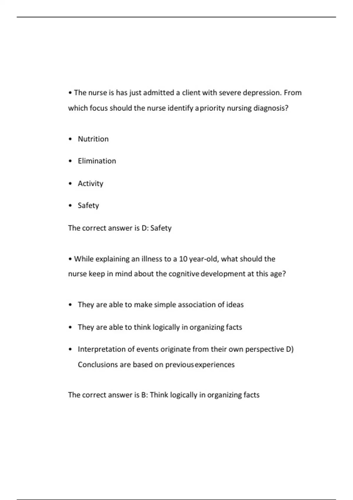 able to make simple association of ideas • They are able to think logically in organizing facts • Interpretation of events originate from their own perspective D) Conclusions are based on previousexperiences The correct answer is B: Think logically in organizing facts • The nurse enters the room as a 3 year-old is having a generalized seizure. Which intervention should the nurse do first? • Clear the area of any hazards • Place the child on the side • Restrain the child • Give the prescribed anticonvulsant The correct answer is B: Place the child on the side • The nurse is reviewing a depressed client's history from an earlier admission. Documentation of anhedonia is noted. The nurse understands that this finding refers to • Reports of difficulty falling and staying asleep • Expression of persistent suicidal thoughts • Lack of enjoyment in usual pleasures 3 • Reduced senses of taste and smell The correct answer is C: Lack of enjoyment in usual pleasures