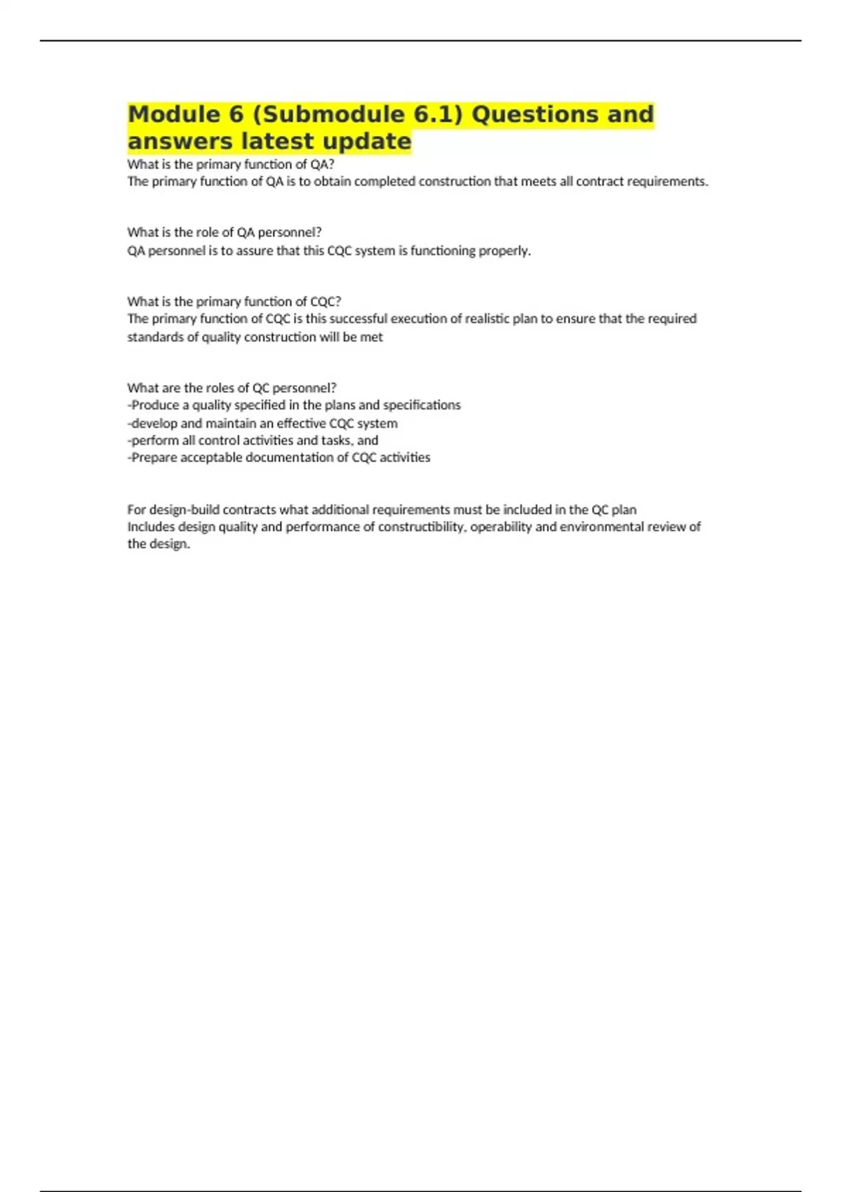 The primary function of QA is to obtain completed construction that meets all contract requirements.