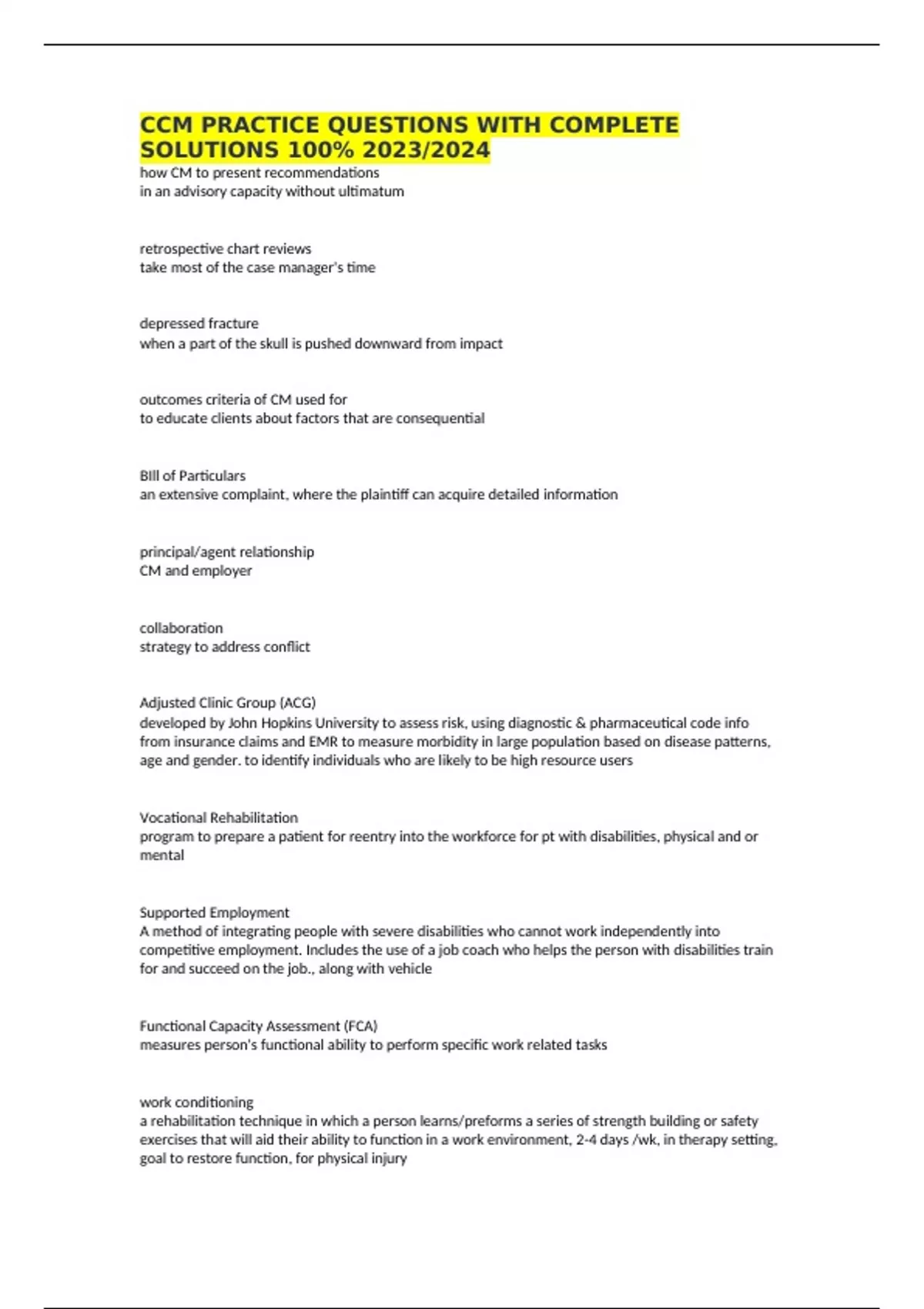 CCM PRACTICE QUESTIONS WITH COMPLETE SOLUTIONS 100% 2023/2024 how CM to present recommendations in an advisory capacity without ultimatum retrospective chart reviews take most of the case manager's time depressed fracture when a part of the skull is pushed downward from impact outcomes criteria of CM used for to educate clients about factors that are consequential BIll of Particulars an extensive complaint, where the plaintiff can acquire detailed information principal/agent relationship CM and employer collaboration strategy to address conflict Adjusted Clinic Group (ACG) developed by John Hopkins University to assess risk, using diagnostic & pharmaceutical code info from insurance claims and EMR to measure morbidity in large population based on disease patterns, age and gender. to identify individuals who are likely to be high resource users Vocational Rehabilitation program to prepare a patient for reentry into the workforce for pt with disabilities, physical and or mental Supported Employment A method of integrating people with severe disabilities who cannot work independently into competitive employment. Includes the use of a job coach who helps the person with disabilities train for and succeed on the job., along with vehicle Functional Capacity Assessment (FCA) measures person's functional ability to perform specific work related tasks work conditioning a rehabilitation technique in which a person learns/preforms a series of strength building or safety exercises that will aid their ability to function in a work environment, 2-4 days /wk, in therapy setting, goal to restore function, for physical injury
