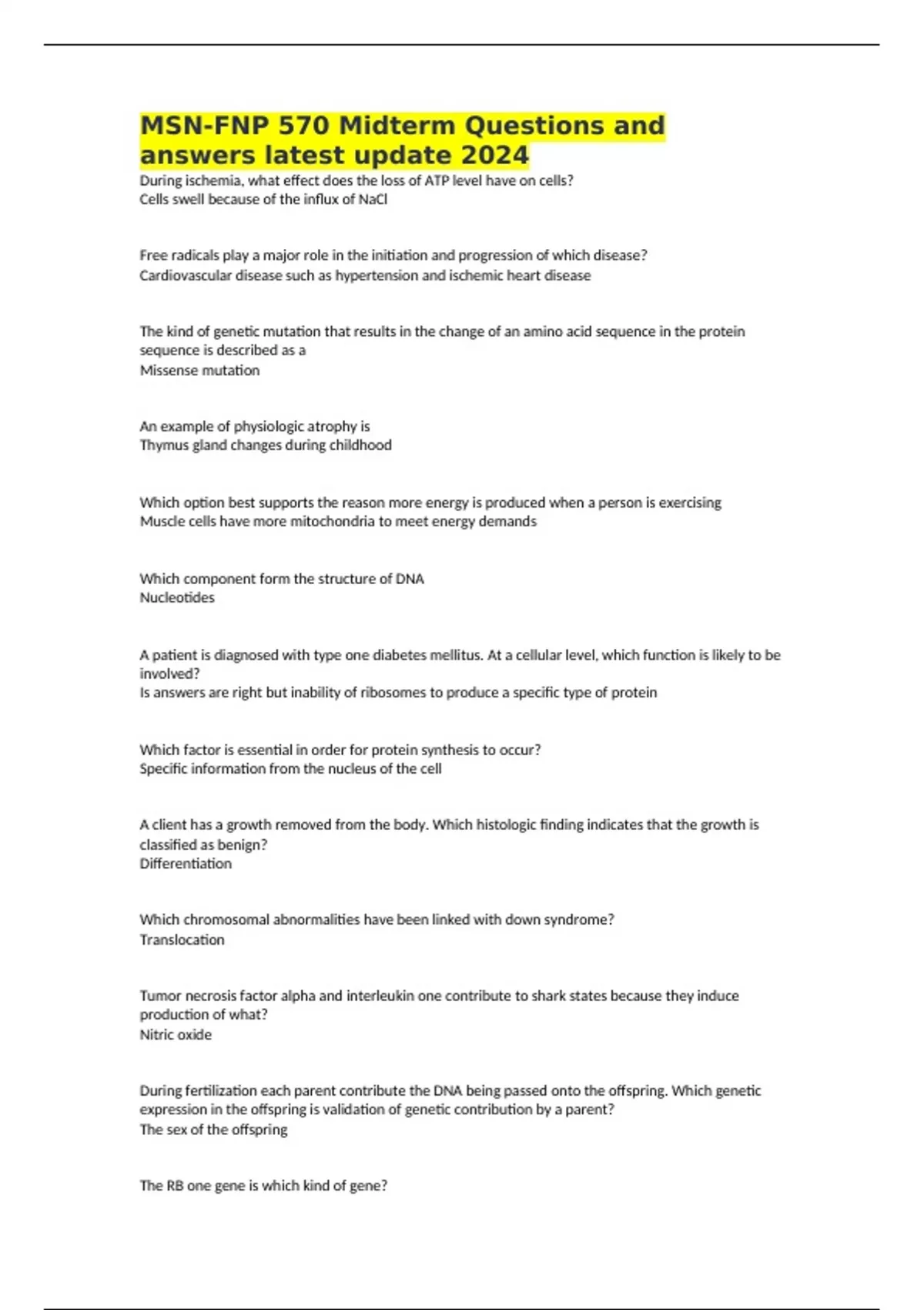 MSN-FNP 570 Midterm Questions and answers latest update 2024 During ischemia, what effect does the loss of ATP level have on cells? Cells swell because of the influx of NaCl Free radicals play a major role in the initiation and progression of which disease? Cardiovascular disease such as hypertension and ischemic heart disease The kind of genetic mutation that results in the change of an amino acid sequence in the protein sequence is described as a Missense mutation An example of physiologic atrophy is Thymus gland changes during childhood Which option best supports the reason more energy is produced when a person is exercising Muscle cells have more mitochondria to meet energy demands Which component form the structure of DNA Nucleotides A patient is diagnosed with type one diabetes mellitus. At a cellular level, which function is likely to be involved? Is answers are right but inability of ribosomes to produce a specific type of protein Which factor is essential in order for protein synthesis to occur? Specific information from the nucleus of the cell A client has a growth removed from the body. Which histologic finding indicates that the growth is classified as benign? Differentiation Which chromosomal abnormalities have been linked with down syndrome? Translocation Tumor necrosis factor alpha and interleukin one contribute to shark states because they induce production of what? Nitric oxide During fertilization each parent contribute the DNA being passed onto the offspring. Which genetic expression in the offspring is validation of genetic contribution by a parent? The sex of the offspring