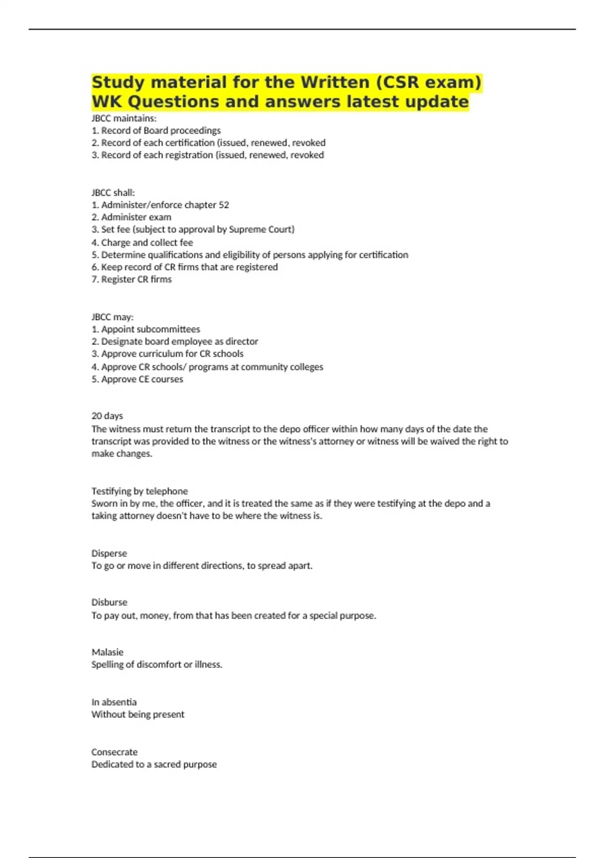 Study material for the Written (CSR exam) WK Questions and answers latest update JBCC maintains: 1. Record of Board proceedings 2. Record of each certification (issued, renewed, revoked 3. Record of each registration (issued, renewed, revoked JBCC shall: 1. Administer/enforce chapter 52 2. Administer exam 3. Set fee (subject to approval by Supreme Court) 4. Charge and collect fee 5. Determine qualifications and eligibility of persons applying for certification 6. Keep record of CR firms that are registered 7. Register CR firms JBCC may: 1. Appoint subcommittees 2. Designate board employee as director 3. Approve curriculum for CR schools 4. Approve CR schools/ programs at community colleges 5. Approve CE courses 20 days The witness must return the transcript to the depo officer within how many days of the date the transcript was provided to the witness or the witness's attorney or witness will be waived the right to make changes. Testifying by telephone Sworn in by me, the officer, and it is treated the same as if they were testifying at the depo and a taking attorney doesn't have to be where the witness is. Disperse To go or move in different directions, to spread apart. Disburse To pay out, money, from that has been created for a special purpose. Malasie Spelling of discomfort or illness. In absentia Without being present Consecrate Dedicated to a sacred purpose