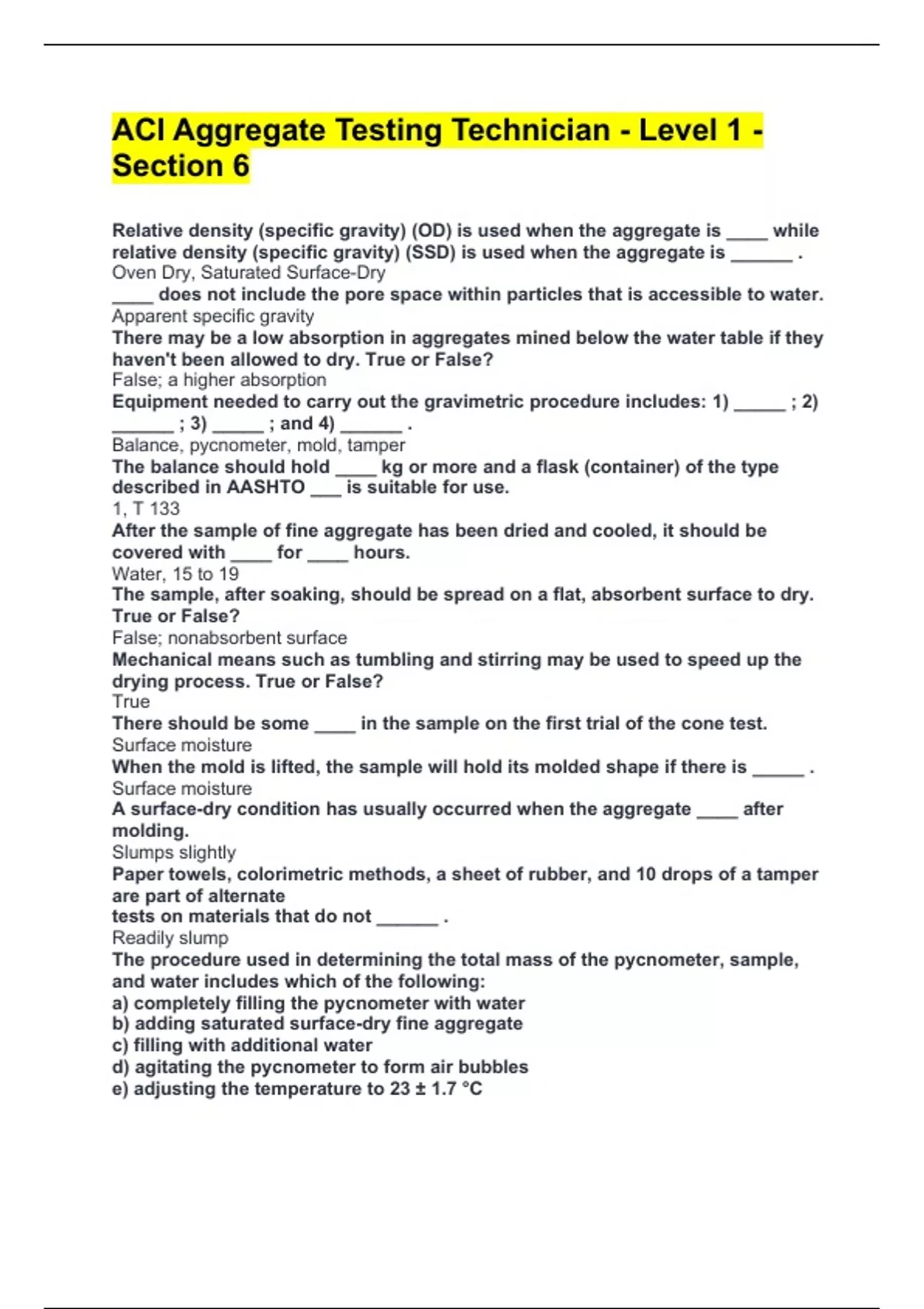 ACI Aggregate Testing Technician - Level 1 - Section 6 Relative density (specific gravity) (OD) is used when the aggregate is ____ while relative density (specific gravity) (SSD) is used when the aggregate is ______ . Oven Dry, Saturated Surface-Dry ____ does not include the pore space within particles that is accessible to water. Apparent specific gravity There may be a low absorption in aggregates mined below the water table if they haven't been allowed to dry. True or False? False; a higher absorption Equipment needed to carry out the gravimetric procedure includes: 1) _____ ; 2) ______ ; 3) _____ ; and 4) ______ . Balance, pycnometer, mold, tamper The balance should hold ____ kg or more and a flask (container) of the type described in AASHTO ___ is suitable for use. 1, T 133 After the sample of fine aggregate has been dried and cooled, it should be covered with ____ for ____ hours. Water, 15 to 19 The sample, after soaking, should be spread on a flat, absorbent surface to dry. True or False?