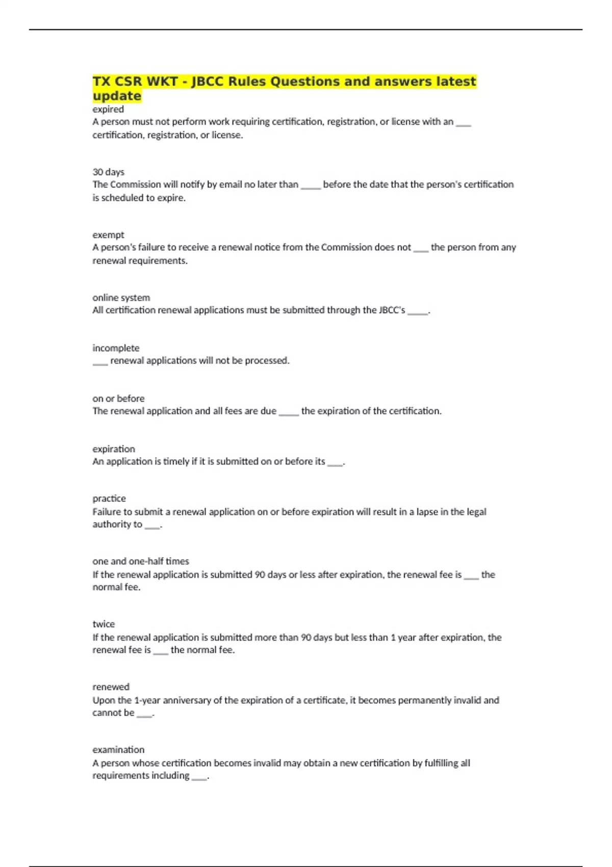 TX CSR WKT - JBCC Rules Questions and answers latest update expired A person must not perform work requiring certification, registration, or license with an ___ certification, registration, or license. 30 days The Commission will notify by email no later than ____ before the date that the person's certification is scheduled to expire. exempt A person's failure to receive a renewal notice from the Commission does not ___ the person from any renewal requirements. online system All certification renewal applications must be submitted through the JBCC's ____. incomplete ___ renewal applications will not be processed. on or before The renewal application and all fees are due ____ the expiration of the certification. expiration An application is timely if it is submitted on or before its ___. practice Failure to submit a renewal application on or before expiration will result in a lapse in the legal authority to ___. one and one-half times If the renewal application is submitted 90 days or less after expiration, the renewal fee is ___ the normal fee. twice If the renewal application is submitted more than 90 days but less than 1 year after expiration, the renewal fee is ___ the normal fee. renewed Upon the 1-year anniversary of the expiration of a certificate, it becomes permanently invalid and cannot be ___. examination A person whose certification becomes invalid may obtain a new certification by fulfilling all requirements including ___.
