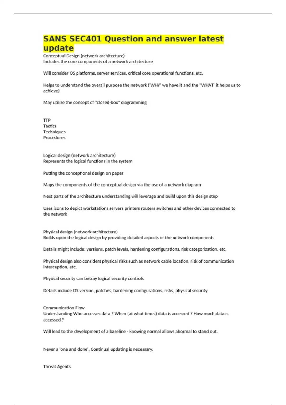 SANS SEC401 Question and answer latest update Conceptual Design (network architecture) Includes the core components of a network architecture Will consider OS platforms, server services, critical core operational functions, etc. Helps to understand the overall purpose the network ('WHY' we have it and the "WHAT' it helps us to achieve) May utilize the concept of "closed-box" diagramming TTP Tactics Techniques Procedures Logical design (network architecture) Represents the logical functions in the system Putting the conceptional design on paper Maps the components of the conceptual design via the use of a network diagram Next parts of the architecture understanding will leverage and build upon this design step Uses icons to depict workstations servers printers routers switches and other devices connected to the network Physical design (network architecture) Builds upon the logical design by providing detailed aspects of the network components Details might include: versions, patch levels, hardening configurations, risk categorization, etc. Physical design also considers physical risks such as network cable location, risk of communication interception, etc. Physical security can betray logical security controls Details include OS version, patches, hardening configurations, risks, physical security Communication Flow Understanding Who accesses data ? When (at what times) data is accessed ? How much data is accessed ? Will lead to the development of a baseline - knowing normal allows abormal to stand out. Never a 'one and done'. Continual updating is necessary. Threat Agents Opportunistic