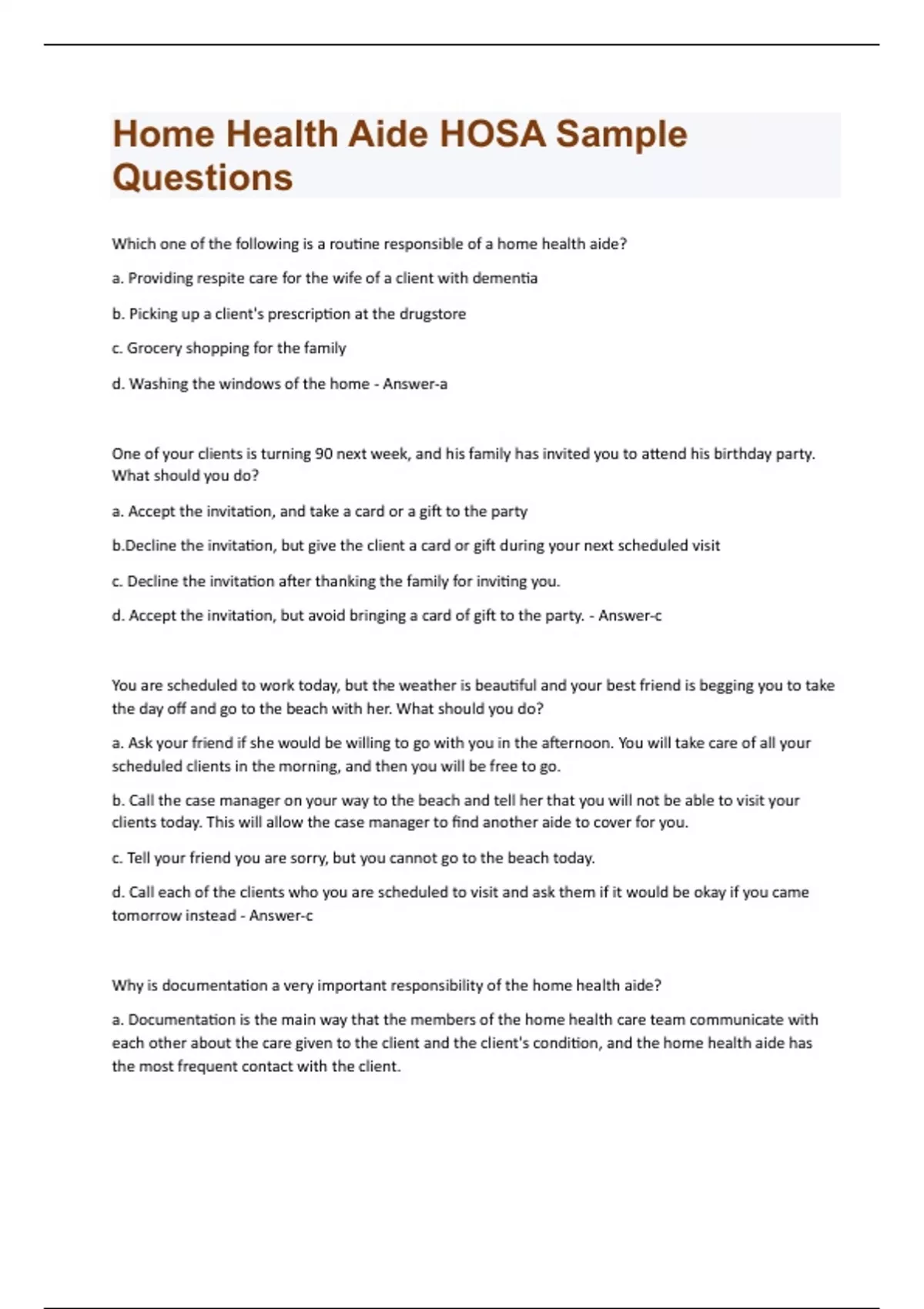 Which one of the following is a routine responsible of a home health aide? a. Providing respite care for the wife of a client with dementia b. Picking up a client's prescription at the drugstore c. Grocery shopping for the family d. Washing the windows of the home - Answer-a One of your clients is turning 90 next week, and his family has invited you to attend his birthday party. What should you do? a. Accept the invitation, and take a card or a gift to the party b.Decline the invitation, but give the client a card or gift during your next scheduled visit c. Decline the invitation after thanking the family for inviting you. d. Accept the invitation, but avoid bringing a card of gift to the party. - Answer-c You are scheduled to work today, but the weather is beautiful and your best friend is begging you to take the day off and go to the beach with her. What should you do? a. Ask your friend if she would be willing to go with you in the afternoon. You will take care of all your scheduled clients in the morning, and then you will be free to go. b. Call the case manager on your way to the beach and tell her that you will not be able to visit your clients today. This will allow the case manager to find another aide to cover for you. c. Tell your friend you are sorry, but you cannot go to the beach today. d. Call each of the clients who you are scheduled to visit and ask them if it would be okay if you came tomorrow instead - Answer-c Why is documentation a very important responsibility of the home health aide? a. Documentation is the main way that the members of the home health care team communicate with each other about the care given to the client and the client's condition, and the home health aide has the most frequent contact with the client.b. Documentation provides information that is used to determine if a client is recovering or getting worse. c. Documentation of all care provided is needed to justify continued payment for home care services d. All of the above - Answer-d Peggy is a home health aide. Today, while Peggy is helping a client, her son's teacher calls Peggy on her cell phone to tell her that her son has had an accident on the playground, and he needs to be picked up. What should Peggy do? a. Tell the client that she has a family emergency and she has to leave b. Tell the teacher that she will be there to pick up her son after her shift ends, in another 2 hours c. Call her supervisor and ask if there is another aide who could cover for her while she goes to pick up her son at school d. Take the client in the car with her to pick up her son - Answer-c Elizabeth has been caring for Mrs. Robinson for several months and has become friendly with her son, Richard. One day, Richard asks Elizabeth for a cup of coffee after she is finished working. What should Elizabeth do? a. Decline Richard's invitation because dating family members of clients is against the home health care agency's policy b. Accept Richard's invitation-after all, she is single and she likes to date c. Ask Mrs. Robinson if it is all right if she dates her son d. Ask Richard if he would be willing to go for a cup of coffee on a day when she is not scheduled to work - Answer-a Case Manager - Answer-Member of the health care team responsible for overseeing a client's care, from admission through discharge Care Plan - Answer-A set of instructions for the clients care Respite Care - Answer-Care that allows the primary caregiver to rest or leave the house for a short period of timeHospice Care - Answer-End-of-life care provided to a person who is terminally ill Time and travel log - Answer-For the home health aide uses to record how much time he spent at each client's house, how much time he spent traveling between houses, and his mileage for the day Homemaker flow sheet - Answer-Form used to document housework that is done