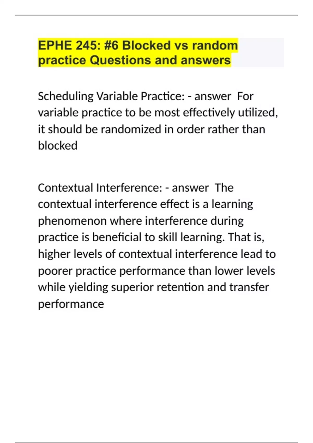 EPHE 245 #6 Blocked vs random practice Questions and answers.