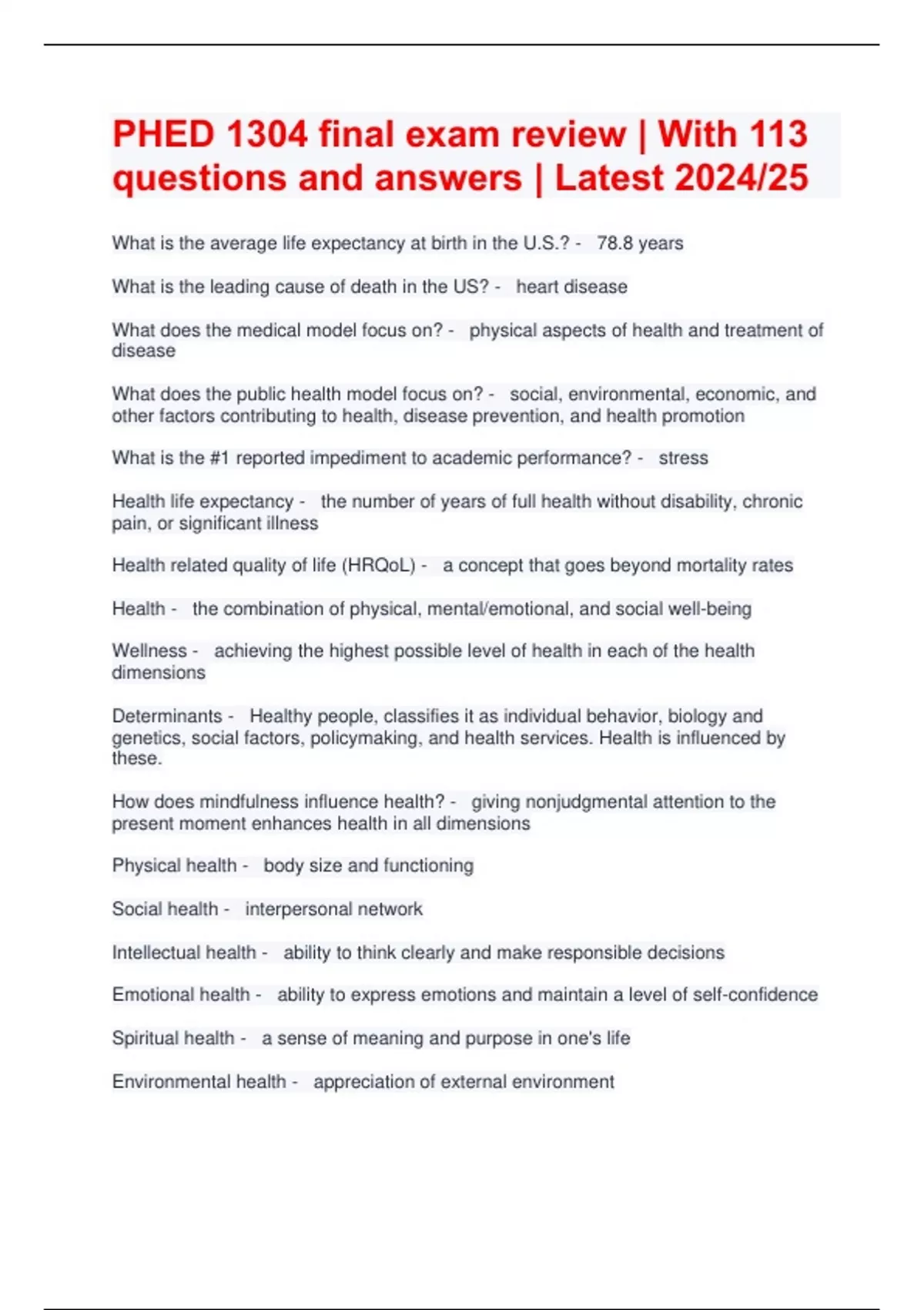 PHED 1304 final exam review | With 113 questions and answers | Latest 2024/25