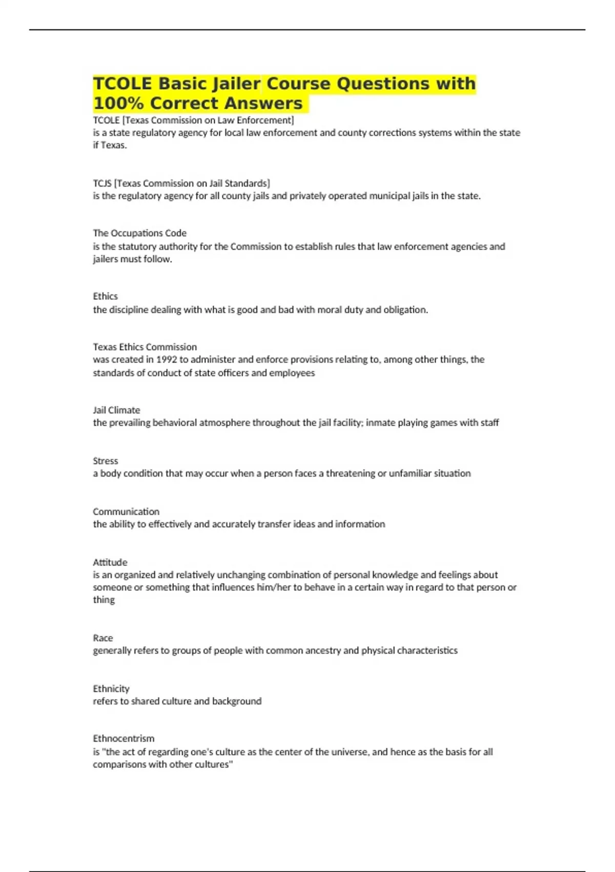 TCOLE Basic Jailer Course Questions with 100% Correct Answers TCOLE [Texas Commission on Law Enforcement] is a state regulatory agency for local law enforcement and county corrections systems within the state if Texas. TCJS [Texas Commission on Jail Standards] is the regulatory agency for all county jails and privately operated municipal jails in the state. The Occupations Code is the statutory authority for the Commission to establish rules that law enforcement agencies and jailers must follow. Ethics the discipline dealing with what is good and bad with moral duty and obligation. Texas Ethics Commission was created in 1992 to administer and enforce provisions relating to, among other things, the standards of conduct of state officers and employees Jail Climate the prevailing behavioral atmosphere throughout the jail facility; inmate playing games with staff Stress a body condition that may occur when a person faces a threatening or unfamiliar situation Communication the ability to effectively and accurately transfer ideas and information Attitude is an organized and relatively unchanging combination of personal knowledge and feelings about someone or something that influences him/her to behave in a certain way in regard to that person or thing Race generally refers to groups of people with common ancestry and physical characteristics Ethnicity refers to shared culture and background Ethnocentrism is "the act of regarding one's culture as the center of the universe, and hence as the basis for all comparisons with other cultures" Prejudice is an adverse judgement or opinion formed beforehand or without knowledge of or examination of the facts Culture a way of thinking and acting based on tradition Discrimination acting on the basis if prejudice Sexual Harassment is deliberate or repeated sexual based behavior that is not welcome, not asked for. and not returned or is unwelcome sexual or gender based behavior Booking recording of certain information relating to the inmate during the admissions process Detainer a report from that documents an agency's authority to retain a person in custody pending a fulfillment of a legal obligation. or transfer to another jurisdiction Commitment an order signed by magistrate directing the sheriff to receive and place in jail the person so committed Warrant a written order from magistrate, dies red to a peace officer or some other person specifically named, commanding him to take the body of a person accused of an offense, to be dealt with a cording to law Capias is a wait issued by the court or clerk, and directed "to any peace officer of the State of Texas", commanding him to arrest a person accused of an offense and bring him before that court immediately, or on a day or at a term stated in the writ Writ of Attachment is a writ issued by a clerk of a court under seal, or by any magistrate, or by the foreman's of a grand jury, in any criminal action or proceeding authorized by law, commanding some peace officer to take the body of a witness and bring him before court, magistrate, or grand jury kn a day named, or forthwith, to testify in behalf of the State or of the defendant, as the case may be Magistrate's Warrant when a compelling is made to a magistrate that any person within his jurisdiction is a fugitive from justice from another state, he shall issue a warrant of arrest directing peace officer to apprehend and bring the accused before him Search the examination of persons or property with the intention of finding evidence ot in plain sight Contraband is considered to be any item, matrrisk, or substance that is prohibited by law or agency directives Strip Search when facility personnel reasonably believe it to be necessary, inmates should undergo a through strip search for weapons and contraband thsy may pose a threat to the security of safety of thr facility Cavity Search basee on "probable casue" that the inmate is concealing contrand in a body cavity Tort a civil or private wrong or injury for which s court will provide a remedy in the form of an action for damages Objective Classification a formal process for separating and managing inmates and administering facilities based upon agency mission, classification goals, agency resources, and inmate program needs Trustee a person who, because of good conduct, is given some measure of freedom in and around the prison or jail Child means a person who is: 10 but under 17 Mental Illness illness, disease, or condition that either substantially impacts a person's thought, perception of reality, emotional process, or judgement, or grossly impairs a person's behavior, as manifested by recent disturbance behavior Insanity is considered "a diminished capacity and inability to tell right fro wrong" Psychosis a group of serious and often debilitating mental disorders that may be of organic or psychological origins and are characterized by some or all of the following symptoms: impaired thinking and reasoning ability, perceptual distortions, inappropriate emotional responses, inappropriate affect, regressive behavior, reduced impulse control and impaired reasoning of reality Delusion false beliefs not based on factual information Hallucination distortions in the senses which cause the individual to experience hearing/seeing something that is not there HIV is the common abbreviation for Human Immunodeficiency Virus AIDS is the common abbreviation for Acquired Immunodeficiency Syndrome Tuberculosis commonly referred to as TB, is an infectious disease caused by a bacterium called mycobacterium tuberculosis Communicable Disease an illness that occurs through the transmission of an infectious agent or its toxic products frk. resivior to a susceptible host, either directly, as from an infected person or animal, or indirectly through an intermediate plant or animal host, a vector, or the inanimate environment Force an aggressive act committed by any person, which does. ot amount yo an assault and is necessary to acco