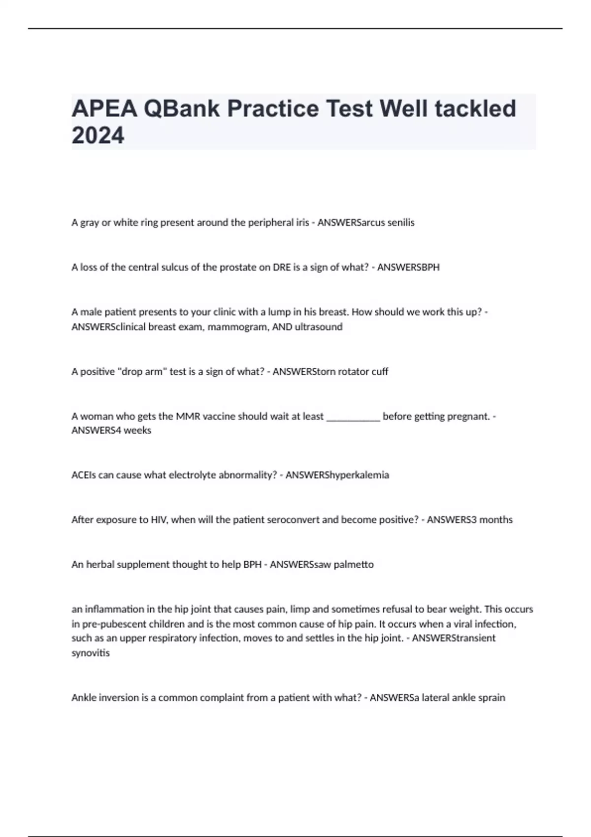 A gray or white ring present around the peripheral iris - ANSWERSarcus senilis A loss of the central sulcus of the prostate on DRE is a sign of what? - ANSWERSBPH A male patient presents to your clinic with a lump in his breast. How should we work this up? - ANSWERSclinical breast exam, mammogram, AND ultrasound A positive "drop arm" test is a sign of what? - ANSWERStorn rotator cuff A woman who gets the MMR vaccine should wait at least __________ before getting pregnant. - ANSWERS4 weeks ACEIs can cause what electrolyte abnormality? - ANSWERShyperkalemia After exposure to HIV, when will the patient seroconvert and become positive? - ANSWERS3 months An herbal supplement thought to help BPH - ANSWERSsaw palmetto an inflammation in the hip joint that causes pain, limp and sometimes refusal to bear weight. This occurs in pre-pubescent children and is the most common cause of hip pain. It occurs when a viral infection, such as an upper respiratory infection, moves to and settles in the hip joint. - ANSWERStransient synovitis Ankle inversion is a common complaint from a patient with what? - ANSWERSa lateral ankle sprain Are saturated or unsaturated fatty acids better for you? - ANSWERSunsaturated Children can start to ride a tricycle around age _____ - ANSWERS3 Diphenhydramine has __________ properties and is contraindicated in which patient populations? - ANSWERSanticholinergic; elderly and those with glaucoma Dix Hallpike maneuver is the standard clinical test for _______ - ANSWERSBPPV For a patient on warfarin who needs to receive a tetracycline antibiotic, how will we adjust their warfarin? - ANSWERStetracyclines depress prothrombin activity, same as warfarin, so we need to decrease the warfarin to avoid an increase in INR and significant bleeding Growing pains often start in what age group? - ANSWERS3-5 HCTZ can cause _________, whereas ACEI can cause _________ - ANSWERShypokalemia; hyperkalemia hey - ANSWERSstopped at top of page 7 HMO and PPOs are called what? - ANSWERSmanaged care plans How can we best diagnose coarctation of the aorta? - ANSWERSby comparing the upper and lower extremity blood pressures How do we manage rubella immunity in pregnant women? - ANSWERSwe screen all pregnant women with a rubella titer. If they had a protective rubella titer in a previous pregnancy, then they do not need to be checked again. If they are found to not be immune when pregnant, then she should be vaccinated AFTER delivery How do we test cerebellar function? - ANSWERSrapid alternating movements, finger to nose test, balance (romberg), gait How do we treat thrush in infants? - ANSWERSapplication of nystatin to inside of the mouth, sterilize all pacifiers and bottle nipples; a topical antifungal may be applied to the nipples How does plantar fasciitis usually present? - ANSWERSas pain in the morning with resolution after several steps, but as it worsens the patient will start to complain of heel pain throughout the day and with walking How is a diagnosis of neuroblastoma confirmed? - ANSWERSvia serum catecholamine testing and a biopsy How is influenza diagnosed? - ANSWERSa nasal swab How is permethrin applied to the skin for scabies? - ANSWERSa one time application to all skin below the neck and then left on for 8-12 hours is sufficient How long must a tick be attached to the skin in order for Lyme disease to be transferred? - ANSWERS48 hours Hyperparathyroidism can cause what? - ANSWERShypercalcemia and thus, osteoporosis If a patient with strep comes back after 48 hours with no improvement on antibiotics, what should you then prescribe? - ANSWERSa penicillin or cephalosporin with beta lactamase coverage Immunizations are considered to be what level of prevention? - ANSWERSprimary In the presence of an elevated serum TSH, what is the next step in management? - ANSWERSrepeat TSH plus free T4 Is age less than 18 years a risk factor for an ectopic pregnancy? - ANSWERSno; but personal history of PID, an IUD, previous ectopic pregnancy, previous tubal surgery, pathology, or ligation all are risk factors Is Meniere's disease most often unilateral or bilateral? - ANSWERSunilateral Koilonychia is a sign of what? - ANSWERSiron deficiency anemia Normal weight people should gain how much weight during pregnancy? - ANSWERS25-35 pounds Obese women should gain how much weight during pregnancy? - ANSWERS11-20 pounds Oral contraceptive regimen in which both the estrogen and progesterone concentrations vary throughout the cycle - ANSWERSquadriphasic Oral contraceptive regimen in which in the estrogen dose remains the same for the first 21 days of the cycle, while progestin is lower in the first half and higher in the second half - ANSWERSbiphasic Oral contraceptive regimen in which the estrogen and progestin doses are fixed throughout the cycle - ANSWERSmonophasic Oral contraceptive regimen in which the estrogen remains consistent and the progestin dose varies - ANSWERStriphasic Overweight women should gain how much weight during pregnancy? - ANSWERS15-25 pounds