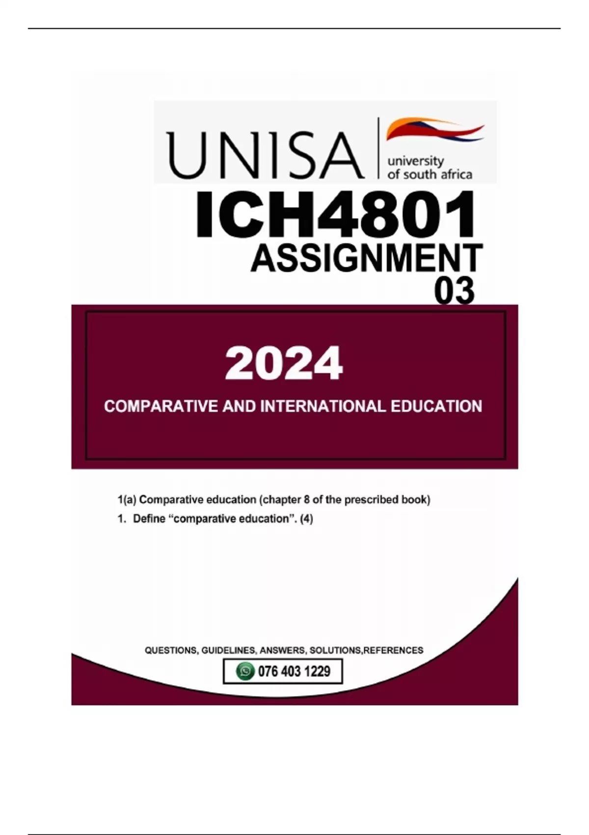 ICH4801 ASSIGNMENT 03 DUE DATE 22 JULY 2024 1(a) Comparative education (chapter 8 of the prescribed book) 1. Define “comparative education”. (4)