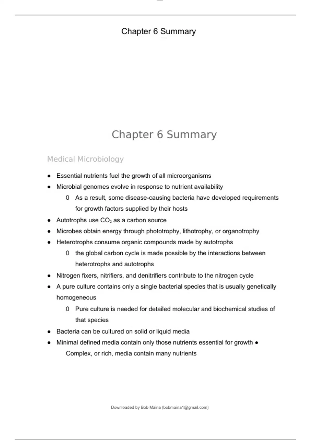 Chapter 6 Summary Medical Microbiology ● Essential nutrients fuel the growth of all microorganisms ● Microbial genomes evolve in response to nutrient availability ○ As a result, some disease-causing bacteria have developed requirements for growth factors supplied by their hosts ● Autotrophs use CO2 as a carbon source ● Microbes obtain energy through phototrophy, lithotrophy, or organotrophy ● Heterotrophs consume organic compounds made by autotrophs ○ the global carbon cycle is made possible by the interactions between heterotrophs and autotrophs ● Nitrogen fixers, nitrifiers, and denitrifiers contribute to the nitrogen cycle ● A pure culture contains only a single bacterial species that is usually genetically homogeneous ○ Pure culture is needed for detailed molecular and biochemical studies of that species ● Bacteria can be cultured on solid or liquid media ● Minimal defined media contain only those nutrients essential for growth ● Complex, or rich, media contain many nutrients ○ Other media exploit specific differences between organisms and can be defined as selective or differential ● Microorganisms in culture may be counted directly under a microscope, with or without staining, or by using a fluorescence-activated cell sorter ● Microorganisms can be counted indirectly, as in viable counts and measurement of optical density ● A viable bacterial organism is defined as a cell with the ability to replicate and form a colony on a solid-medium surface