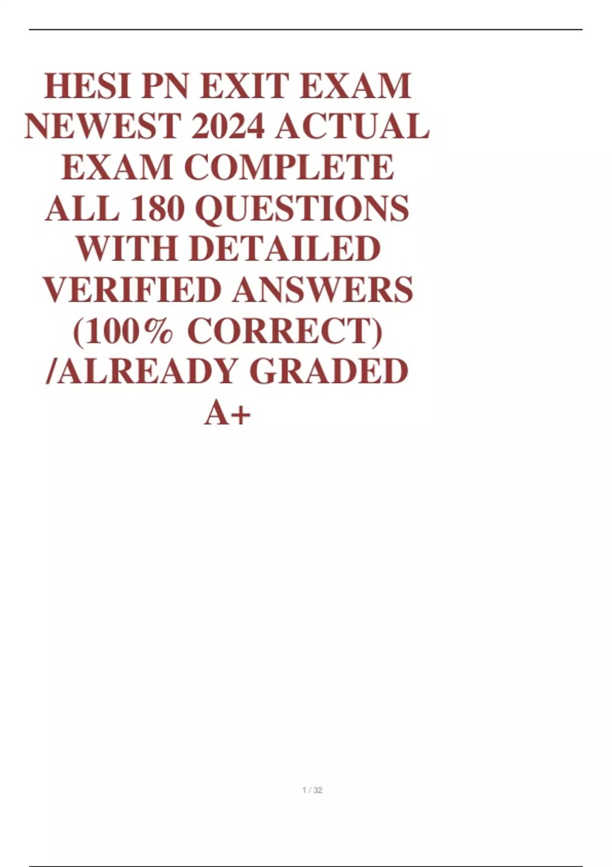 HESI PN EXIT EXAM NEWEST 2024 ACTUAL EXAM COMPLETE ALL 180 QUESTIONS WITH DETAILED VERIFIED ANSWERS (100% CORRECT) /ALREADY GRADED A+