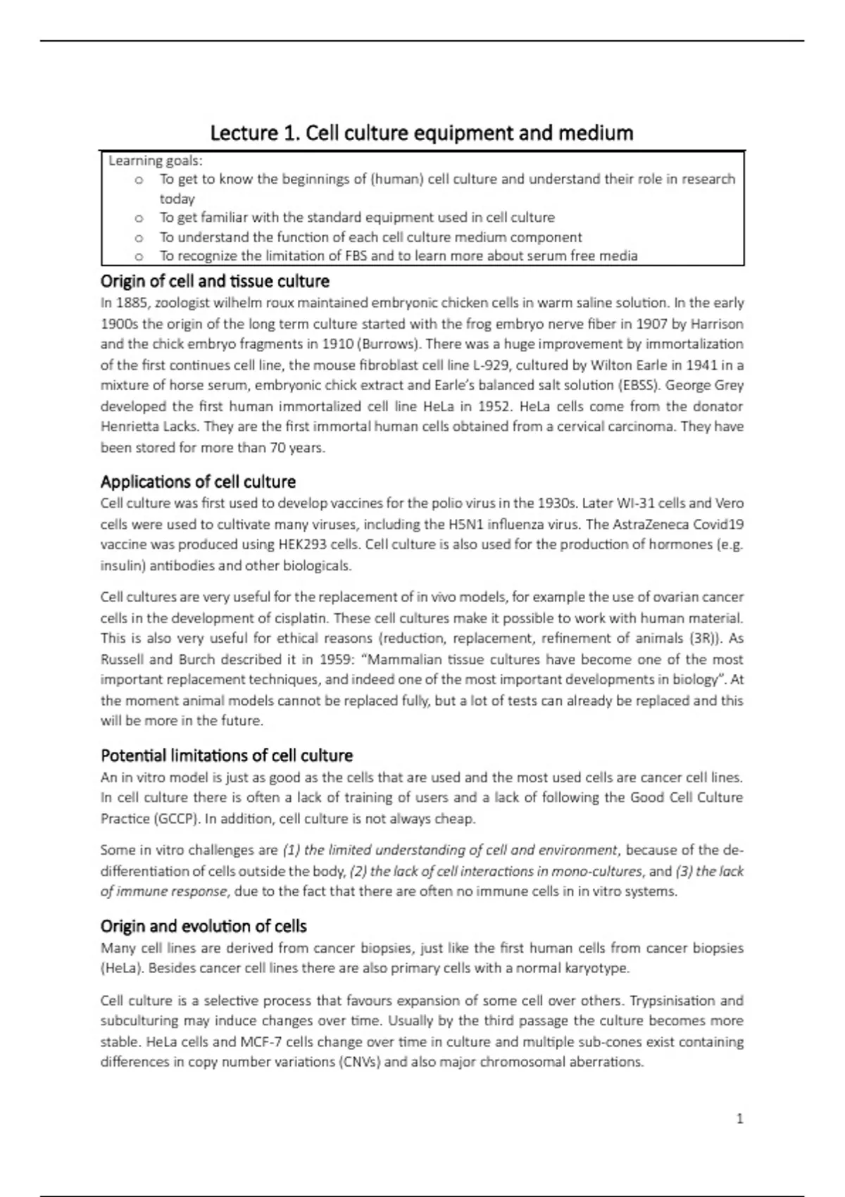 o To get to know the beginnings of (human) cell culture and understand their role in research