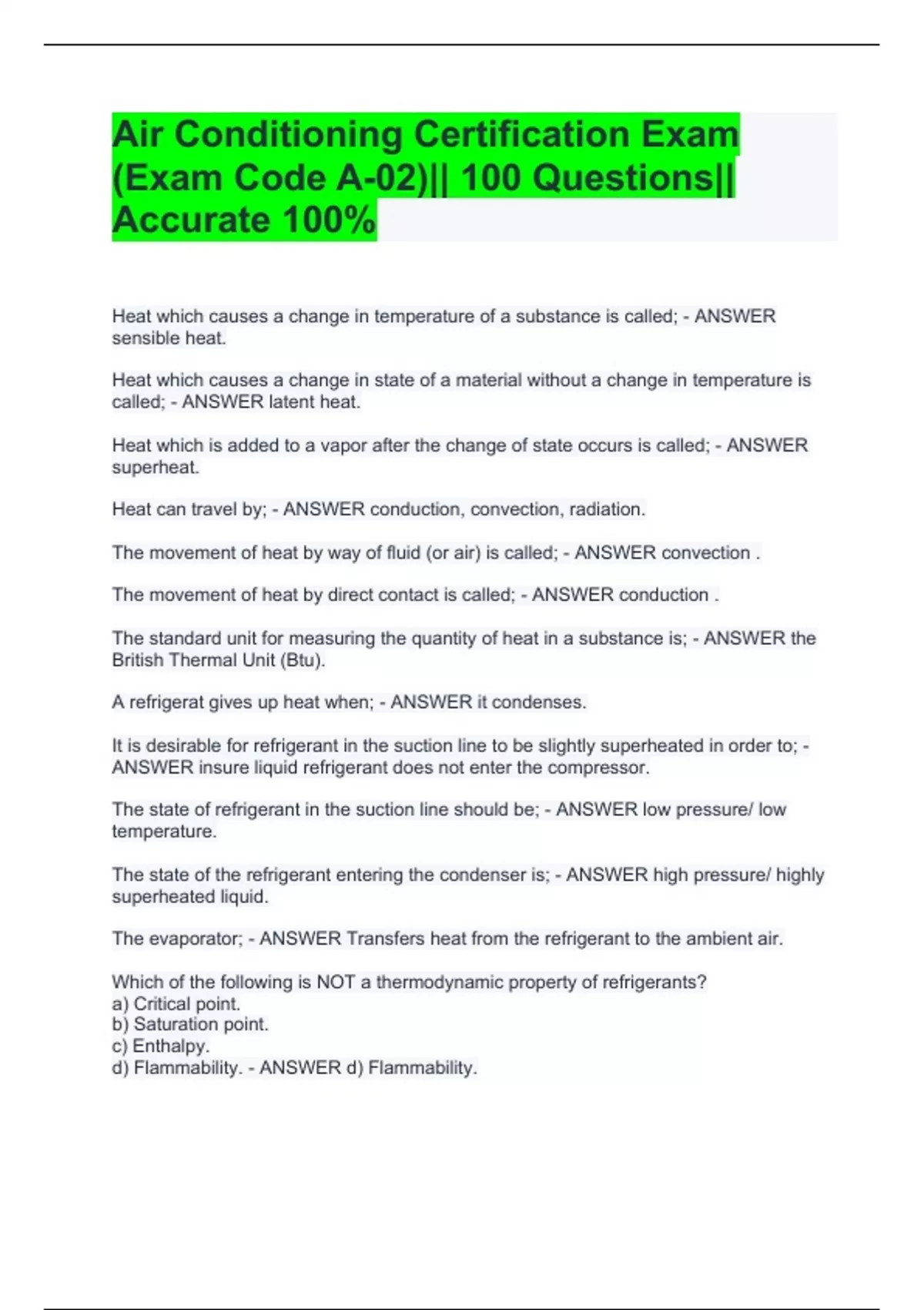 Air Conditioning Certification Exam (Exam Code A-02)|| 100 Questions|| Accurate 100%Heat which causes a change in temperature of a substance is called; - ANSWER sensible heat. Heat which causes a change in state of a material without a change in temperature is called; - ANSWER latent heat. Heat which is added to a vapor after the change of state occurs is called; - ANSWER superheat. Heat can travel by; - ANSWER conduction, convection, radiation. The movement of heat by way of fluid (or air) is called; - ANSWER convection . The movement of heat by direct contact is called; - ANSWER conduction . The standard unit for measuring the quantity of heat in a substance is; - ANSWER the British Thermal Unit (Btu). A refrigerat gives up heat when; - ANSWER it condenses. It is desirable for refrigerant in the suction line to be slightly superheated in order to; - ANSWER insure liquid refrigerant does not enter the compressor. The state of refrigerant in the suction line should be; - ANSWER low pressure/ low temperature. The state of the refrigerant entering the condenser is; - ANSWER high pressure/ highly superheated liquid. The evaporator; - ANSWER Transfers heat from the refrigerant to the ambient air. Which of the following is NOT a thermodynamic property of refrigerants? a) Critical point.