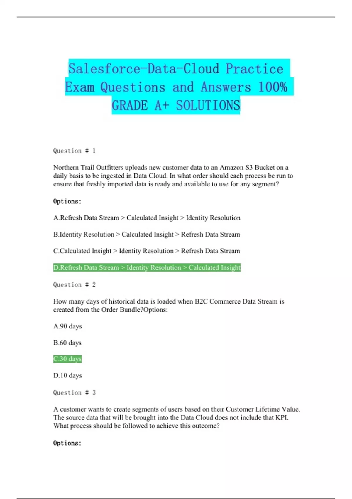 Question # 1 Northern Trail Outfitters uploads new customer data to an Amazon S3 Bucket on a daily basis to be ingested in Data Cloud. In what order should each process be run to ensure that freshly imported data is ready and available to use for any segment? Options: A.Refresh Data Stream > Calculated Insight > Identity Resolution B.Identity Resolution > Calculated Insight > Refresh Data Stream C.Calculated Insight > Identity Resolution > Refresh Data Stream D.Refresh Data Stream > Identity Resolution > Calculated Insight Question # 2 How many days of historical data is loaded when B2C Commerce Data Stream is created from the Order Bundle?Options: A.90 days B.60 days C.30 days D.10 days Question # 3 A customer wants to create segments of users based on their Customer Lifetime Value. The source data that will be brought into the Data Cloud does not include that KPI. What process should be followed to achieve this outcome? Options: A.Map Data to Data Model > Create Calculated Insight > Use in Segmentation B.Ingest Data > Map Data to Data Model > Create Calculated C.Insight > Use in Segmentation D.Ingest Data > Create Calculated Insight > Use in Segmentation E.Create Calculated Insight > Map Data to Data Model > Use in Segmentation Question # 4 Which data model subject area should be used for any Organization, Individual, or Member in the Customer 360 data model? Options: A.  Individual B.Global Account C.  Party D.  Membership Question # 5 A segment fails to refresh with the error "Segment references too many Data Lake Objects (DLOs)". What are two remedies for this issue?Options: A.  Space out the segment schedules to reduce Data Lake Object load B.  Refine segmentation criteria to limit up to 5 custom DMOs C.  Split the segment into smaller segments D.  Use Calculated Insights in order to reduce the complexity of the segmentation query Question # 6 Which feature can integrate in real time with Salesforce CRM? Options: A.  Data Actions B.  Identity Resolution CONTINUED,,,,,,,,,,,