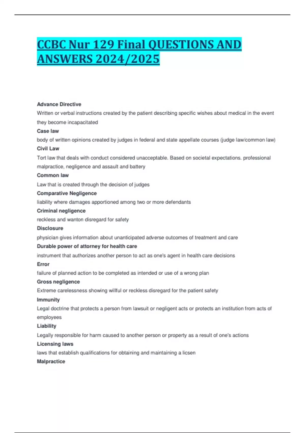 CCBC Nur 129 Final QUESTIONS AND ANSWERS 2024/2025