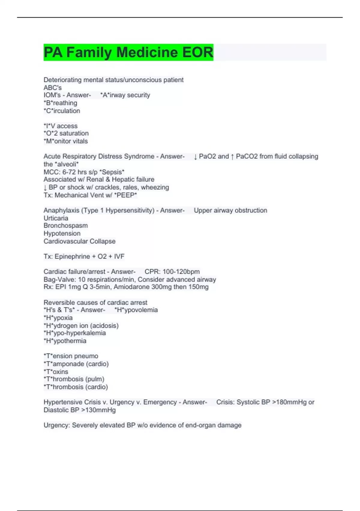 PA Family Medicine EOR Deteriorating mental status/unconscious patient ABC's IOM's - Answer- *A*irway security *B*reathing *C*irculation *I*V access *O*2 saturation *M*onitor vitals Acute Respiratory Distress Syndrome - Answer- ↓ PaO2 and ↑ PaCO2 from fluid collapsing the *alveoli* MCC: 6-72 hrs s/p *Sepsis* Associated w/ Renal & Hepatic failure ↓ BP or shock w/ crackles, rales, wheezing Tx: Mechanical Vent w/ *PEEP* Anaphylaxis (Type 1 Hypersensitivity) - Answer- Upper airway obstruction Urticaria Bronchospasm Hypotension Cardiovascular Collapse Tx: Epinephrine + O2 + IVF Cardiac failure/arrest - Answer- CPR: 100-120bpm Bag-Valve: 10 respirations/min, Consider advanced airway Rx: EPI 1mg Q 3-5min, Amiodarone 300mg then 150mg Reversible causes of cardiac arrest *H's & T's* - Answer- *H*ypovolemia *H*ypoxia *H*ydrogen ion (acidosis) *H*ypo-hyperkalemia *H*ypothermia *T*ension pneumo *T*amponade (cardio) *T*oxins *T*hrombosis (pulm) *T*hrombosis (cardio) Hypertensive Crisis v. Urgency v. Emergency - Answer- Crisis: Systolic BP >180mmHg or Diastolic BP >130mmHg Urgency: Severely elevated BP w/o evidence of end-organ damage Emergency: HTN w/ acute end-organ damage