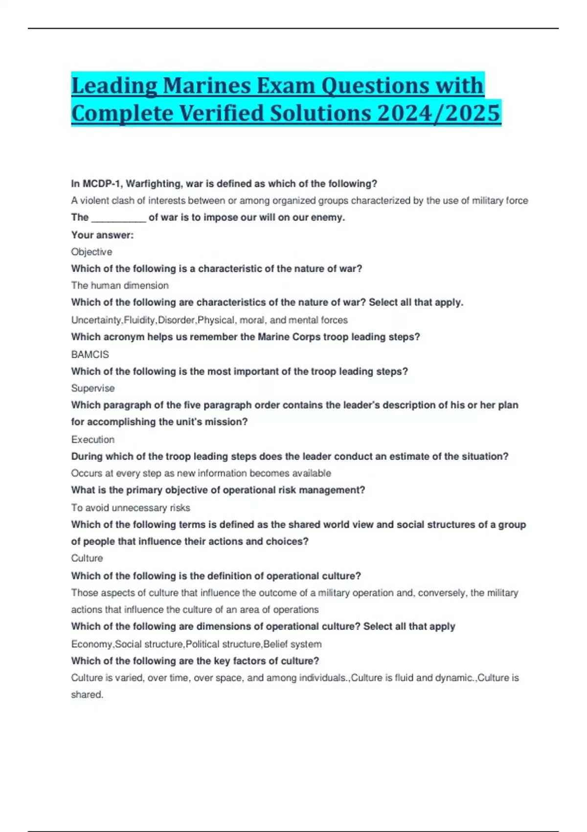 Leading Marines Exam Questions with Complete Verified Solutions 2024/2025