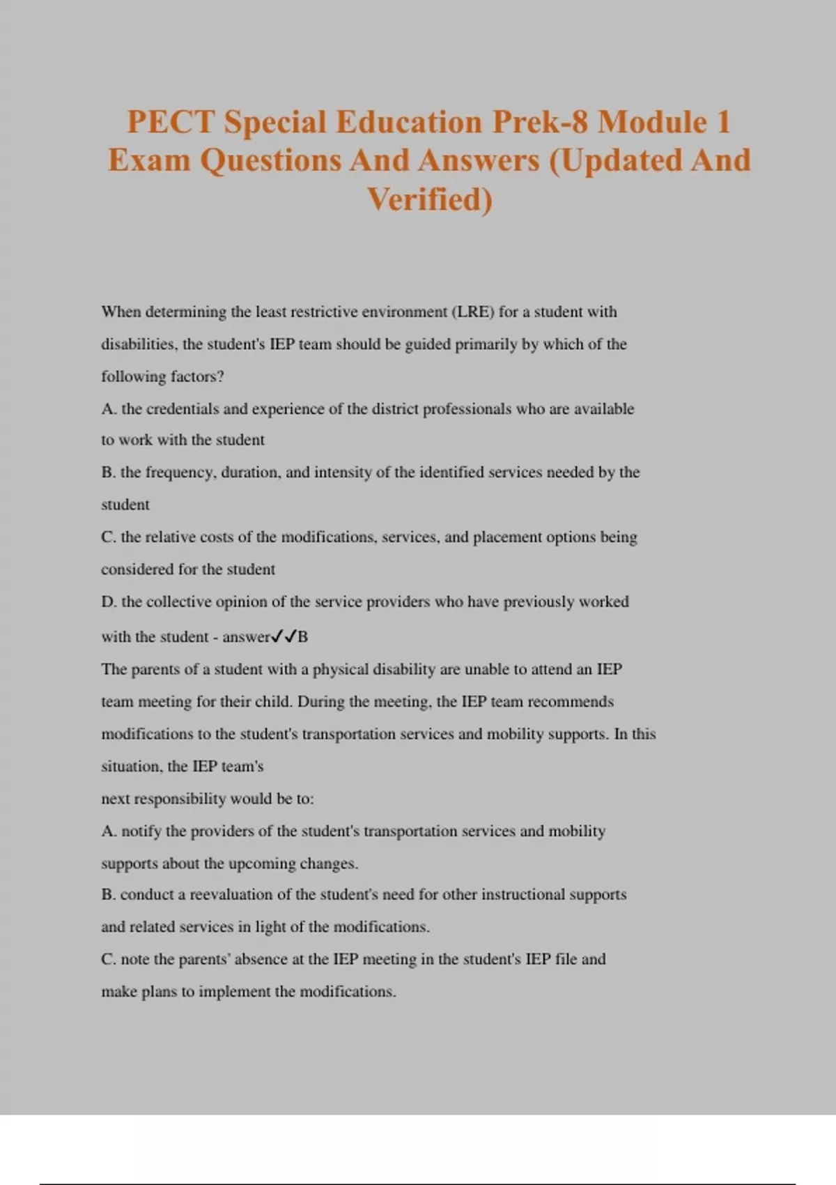 PECT Special Education Prek-8 Module 1 Exam Questions And Answers (Updated And Verified) When determining the least restrictive environment (LRE) for a student with disabilities, the student's IEP team should be guided primarily by which of the following factors? A. the credentials and experience of the district professionals who are available to work with the student B. the frequency, duration, and intensity of the identified services needed by the student C. the relative costs of the modifications, services, and placement options being considered for the student D. the collective opinion of the service providers who have previously worked with the student - answerB The parents of a student with a physical disability are unable to attend an IEP team meeting for their child. During the meeting, the IEP team recommends modifications to the student's transportation services and mobility supports. In this situation, the IEP team's next responsibility would be to: A. notify the providers of the student's transportation services and mobility supports about the upcoming changes. B. conduct a reevaluation of the student's need for other instructional supports and related services in light of the modifications. C. note the parents' absence at the IEP meeting in the student's IEP file and make plans to implement the modifications. D. document the IEP modifications and their reasons for recommending them and send this information to the parents. - answerD A new middle school special education teacher will be working with an experienced paraeducator who will assist in providing services to students in the special education program. Which of the following steps would be most effective for the teacher to take first as he prepares for his initial meeting with the paraeducator? A. gathering anecdotal information about the paraeducator from other teachers who have worked with her B. compiling a comprehensive list of program needs and associated tasks for a paraeducator to complete C. asking the paraeducator to provide a résumé and other documentation of her work experience D. familiarizing himself with the defined roles and expectations for paraeducators in his district - answerD A second-grade student is referred for a comprehensive individual evaluation because of an inability to recall the letters of the alphabet in sequential order and an inability to make letter-sound associations. When selecting assessment instruments to include in this student's evaluation, the team should first consider an assessment instrument's ability to: A. produce data relevant to the student's educational needs. B. measure the student's development across multiple domains. C. be modified to accommodate the student's disability. D. provide a baseline for measuring the student's future progress. - answerA A fifth-grade student receives special education services due to a specific learning disability and ADHD. He is easily distracted, fidgets with school materials when seated at his desk, and disturbs classmates. The most effective way for the
