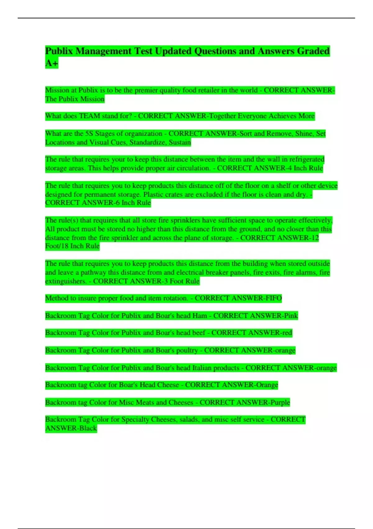 Publix Management Test Updated Questions and Answers Graded A+ Mission at Publix is to be the premier quality food retailer in the world - CORRECT ANSWER-The Publix Mission What does TEAM stand for? - CORRECT ANSWER-Together Everyone Achieves More What are the 5S Stages of organization - CORRECT ANSWER-Sort and Remove, Shine, Set Locations and Visual Cues, Standardize, Sustain The rule that requires your to keep this distance between the item and the wall in refrigerated storage areas. This helps provide proper air circulation. - CORRECT ANSWER-4 Inch Rule The rule that requires you to keep products this distance off of the floor on a shelf or other device designed for permanent storage. Plastic crates are excluded if the floor is clean and dry. - CORRECT ANSWER-6 Inch Rule The rule(s) that requires that all store fire sprinklers have sufficient space to operate effectively. All product must be stored no higher than this distance from the ground, and no closer than this distance from the fire sprinkler and across the plane of storage. - CORRECT ANSWER-12 Foot/18 Inch Rule The rule that requires you to keep products this distance from the building when stored outside and leave a pathway this distance from and electrical breaker panels, fire exits, fire alarms, fire extinguishers. - CORRECT ANSWER-3 Foot Rule Method to insure proper food and item rotation. - CORRECT ANSWER-FIFO Backroom Tag Color for Publix and Boar's head Ham - CORRECT ANSWER-Pink Backroom Tag Color for Publix and Boar's head beef - CORRECT ANSWER-red Backroom Tag Color for Publix and Boar's poultry - CORRECT ANSWER-orange Backroom Tag Color for Publix and Boar's head Italian products - CORRECT ANSWER-orange Backroom tag Color for Boar's Head Cheese - CORRECT ANSWER-Orange Backroom tag Color for Misc Meats and Cheeses - CORRECT ANSWER-Purple Backroom Tag Color for Specialty Cheeses, salads, and misc self service - CORRECT ANSWER-Black Backroom Tag Color for Cooked and Prepared foods and ingredients - CORRECT ANSWER-White
