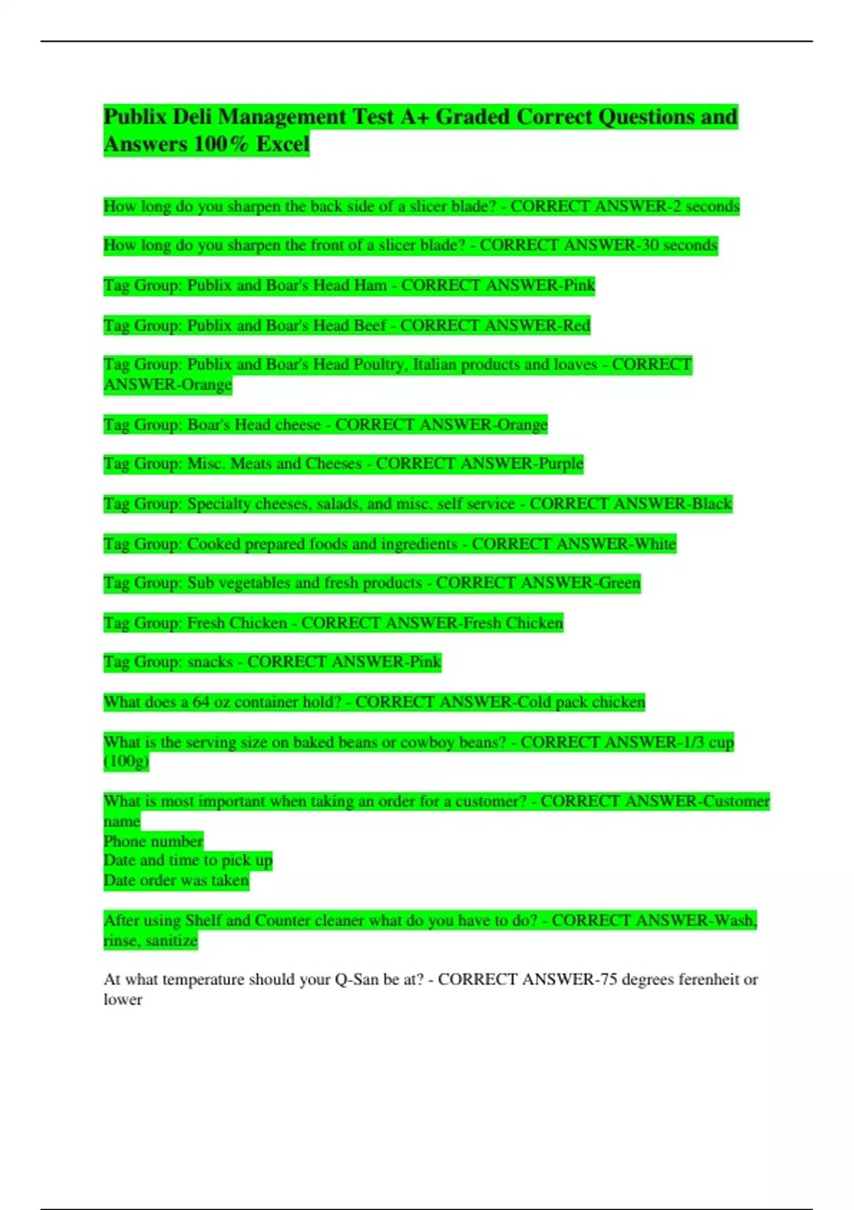 Publix Deli Management Test A+ Graded Correct Questions and Answers 100% Excel How long do you sharpen the back side of a slicer blade? - CORRECT ANSWER-2 seconds How long do you sharpen the front of a slicer blade? - CORRECT ANSWER-30 seconds Tag Group: Publix and Boar's Head Ham - CORRECT ANSWER-Pink Tag Group: Publix and Boar's Head Beef - CORRECT ANSWER-Red Tag Group: Publix and Boar's Head Poultry, Italian products and loaves - CORRECT ANSWER-Orange Tag Group: Boar's Head cheese - CORRECT ANSWER-Orange Tag Group: Misc. Meats and Cheeses - CORRECT ANSWER-Purple Tag Group: Specialty cheeses, salads, and misc. self service - CORRECT ANSWER-Black Tag Group: Cooked prepared foods and ingredients - CORRECT ANSWER-White Tag Group: Sub vegetables and fresh products - CORRECT ANSWER-Green Tag Group: Fresh Chicken - CORRECT ANSWER-Fresh Chicken Tag Group: snacks - CORRECT ANSWER-Pink What does a 64 oz container hold? - CORRECT ANSWER-Cold pack chicken What is the serving size on baked beans or cowboy beans? - CORRECT ANSWER-1/3 cup (100g) What is most important when taking an order for a customer? - CORRECT ANSWER-Customer name Phone number Date and time to pick up Date order was taken After using Shelf and Counter cleaner what do you have to do? - CORRECT ANSWER-Wash, rinse, sanitize At what temperature should your Q-San be at? - CORRECT ANSWER-75 degrees ferenheit or lower