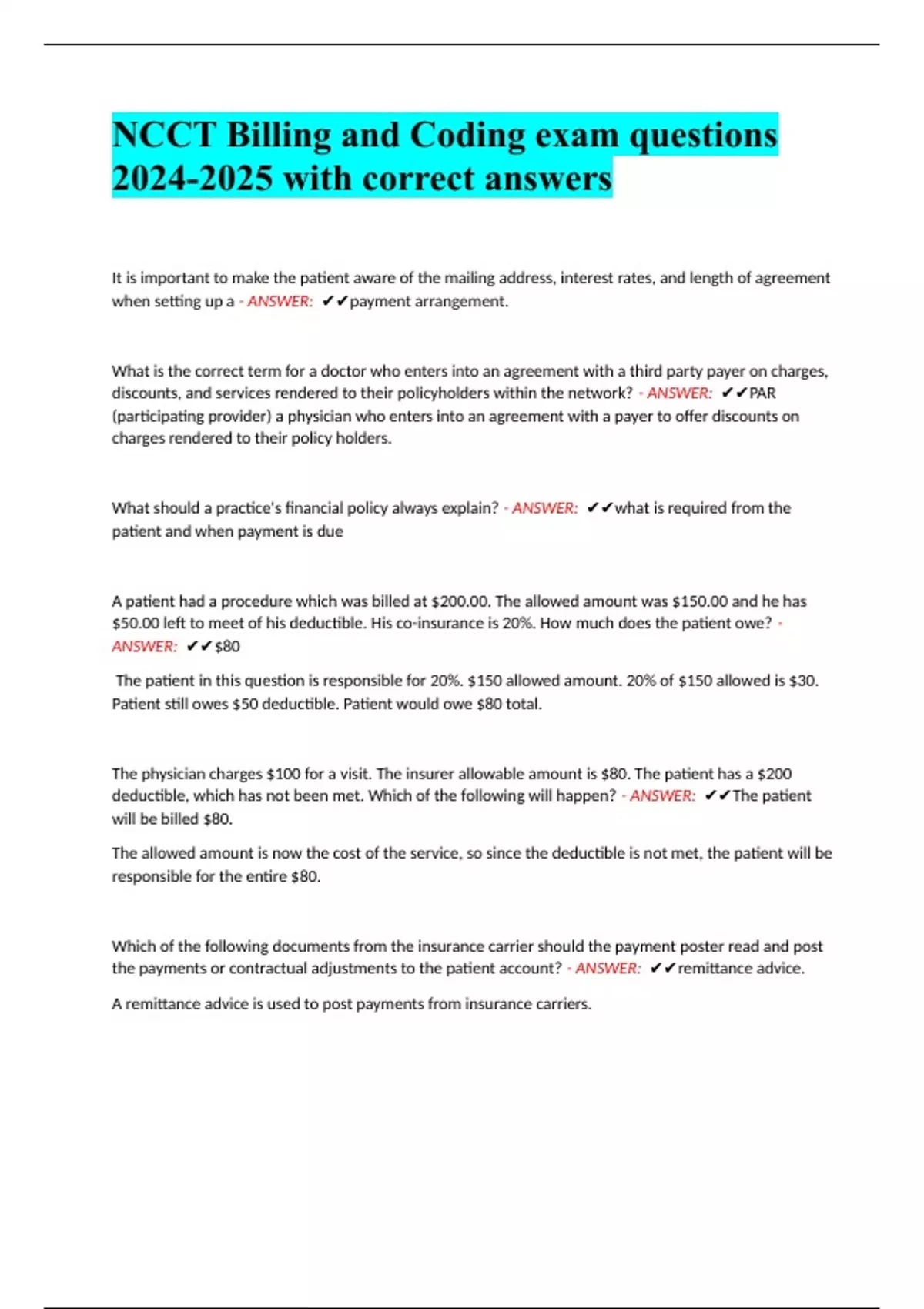 NCCT Billing and Coding exam questions with correct answers
