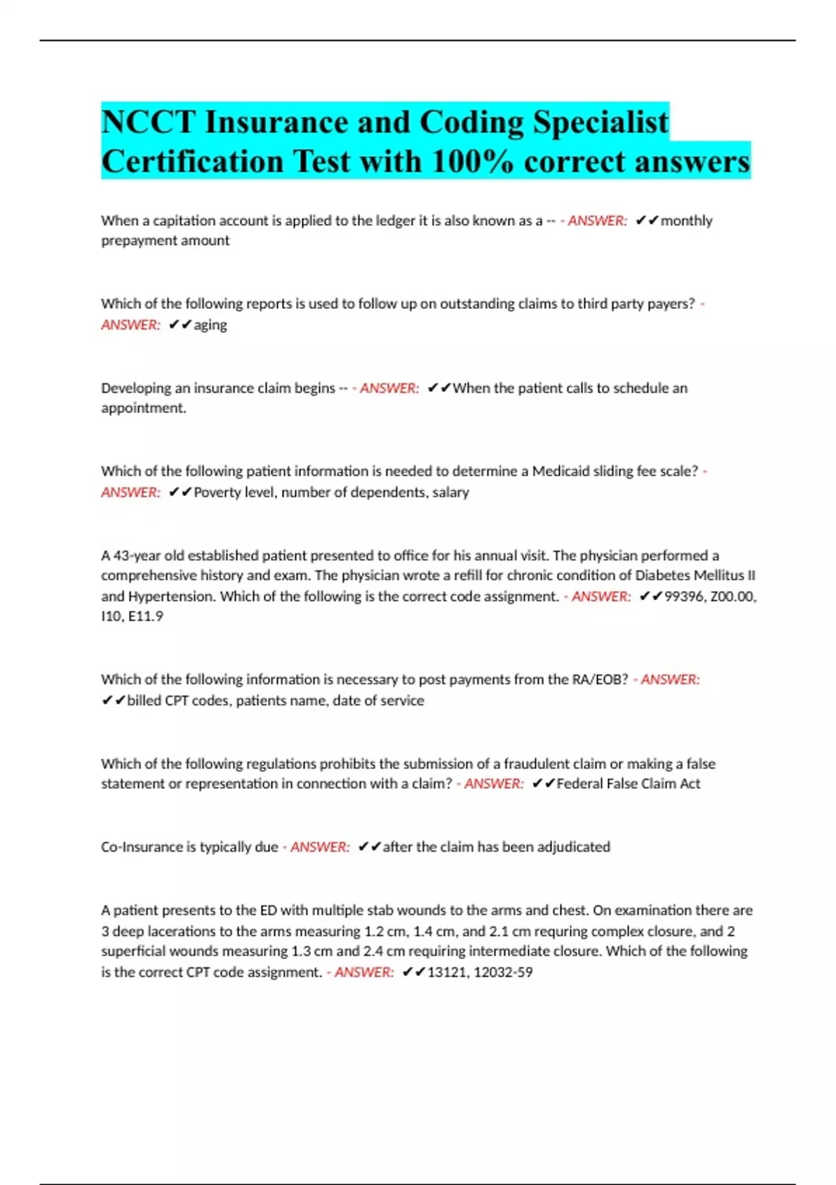 NCCT Insurance and Coding Specialist Certification Test with 100% correct answers