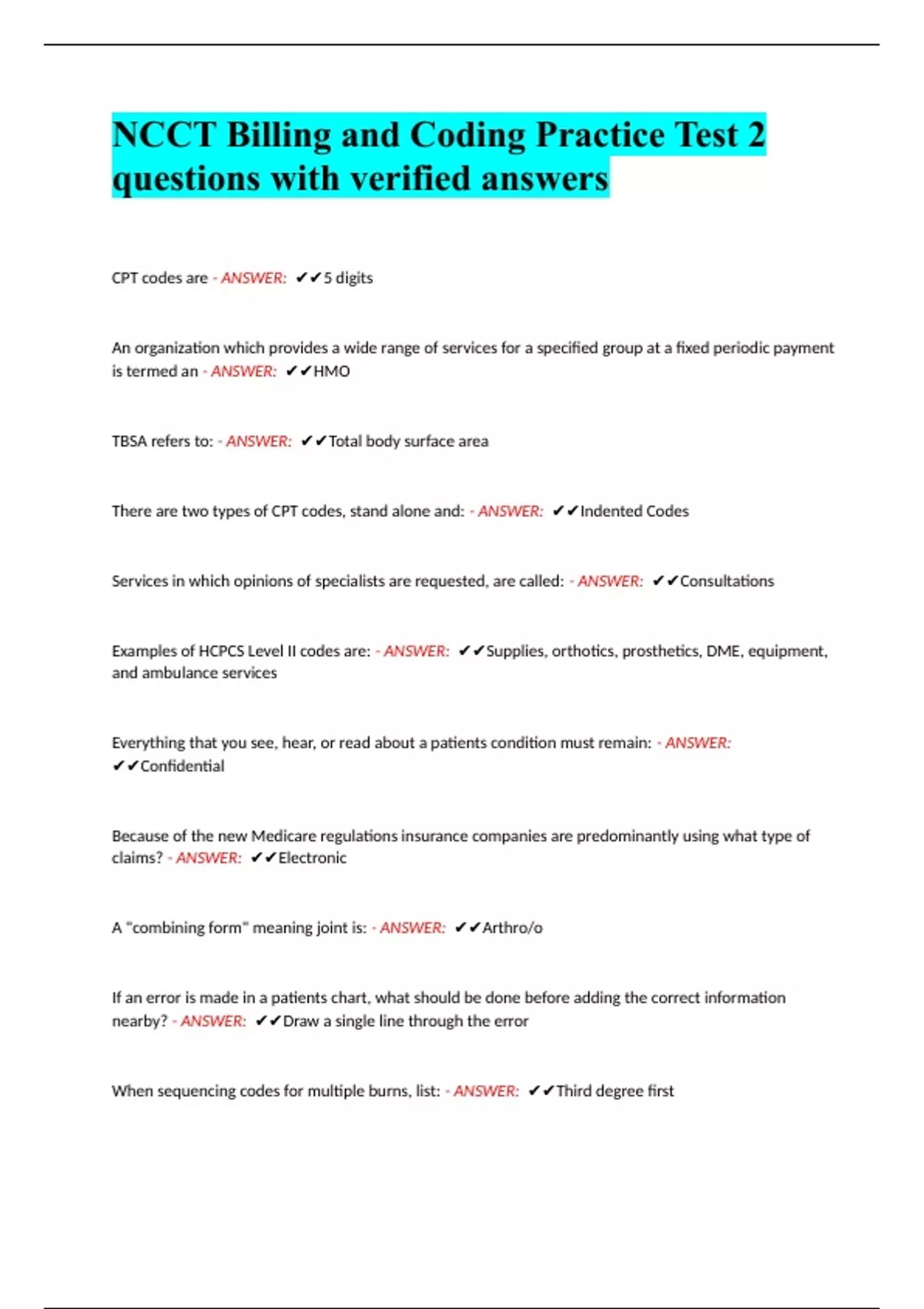 NCCT Billing and Coding Practice Test 2 questions with verified answers