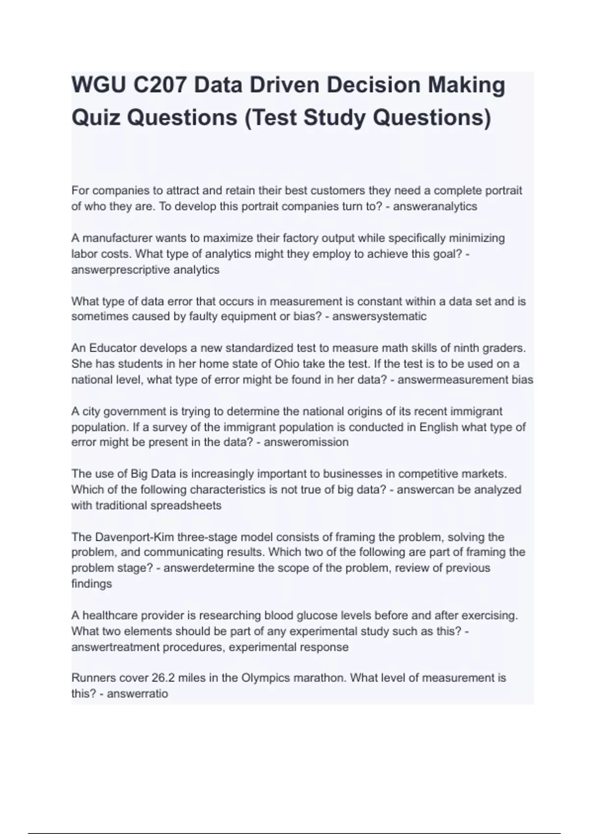 WGU C207 Data Driven Decision Making Quiz Questions (Test Study Questions)
