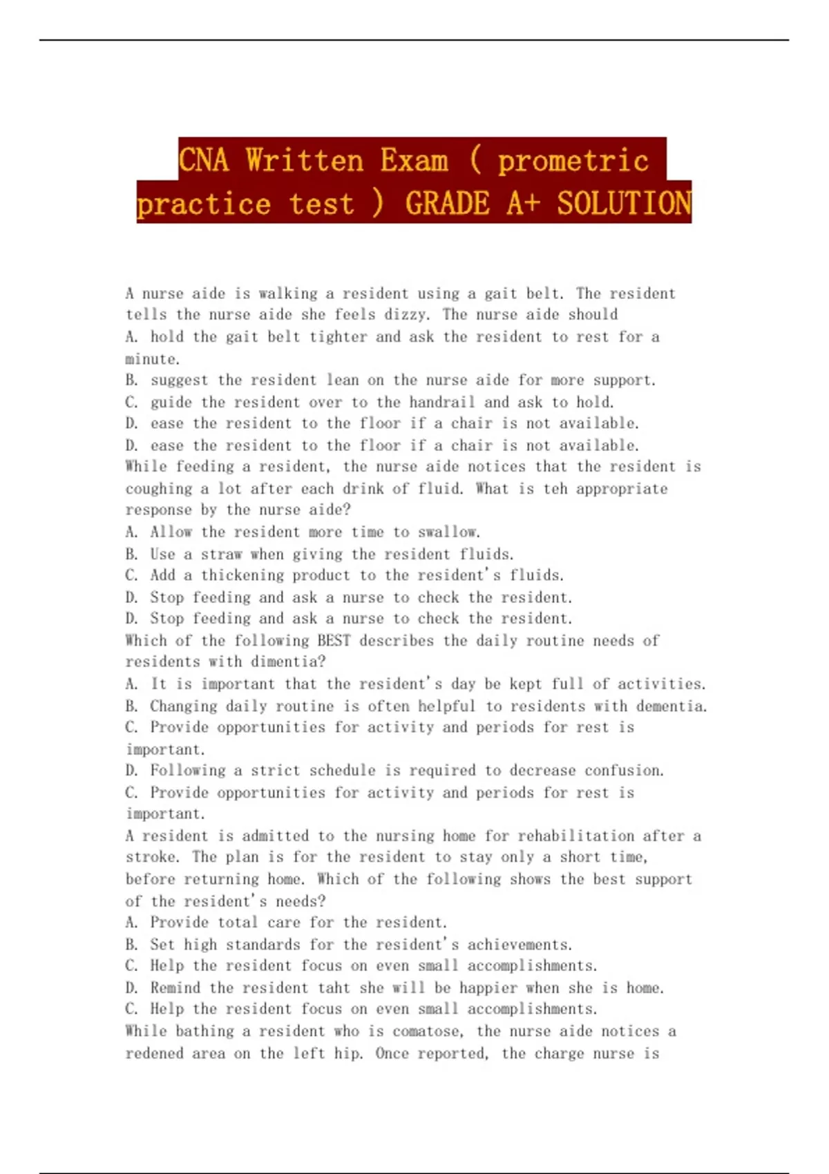 CNA Written Exam ( prometric practice test ) GRADE A+ SOLUTION