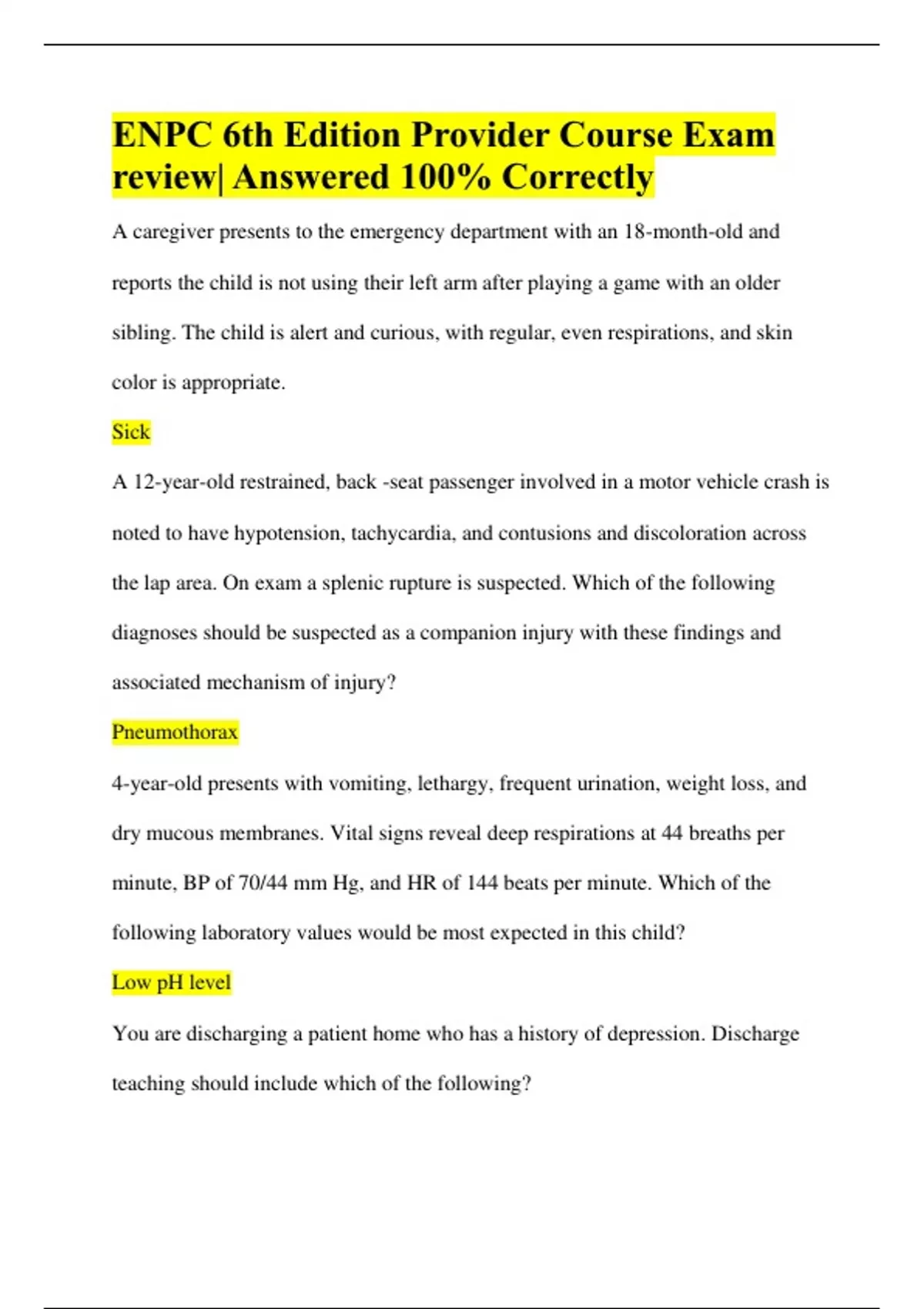 ENPC 6th Edition Provider Course Exam review| Answered 100% Correctly A caregiver presents to the emergency department with an 18-month-old and reports the child is not using their left arm after playing a game with an older sibling. The child is alert and curious, with regular, even respirations, and skin color is appropriate. Sick A 12-year-old restrained, back -seat passenger involved in a motor vehicle crash is noted to have hypotension, tachycardia, and contusions and discoloration across the lap area. On exam a splenic rupture is suspected. Which of the following diagnoses should be suspected as a companion injury with these findings and associated mechanism of injury? Pneumothorax 4-year-old presents with vomiting, lethargy, frequent urination, weight loss, and dry mucous membranes. Vital signs reveal deep respirations at 44 breaths per minute, BP of 70/44 mm Hg, and HR of 144 beats per minute. Which of the following laboratory values would be most expected in this child? Low pH level You are discharging a patient home who has a history of depression. Discharge teaching should include which of the following?