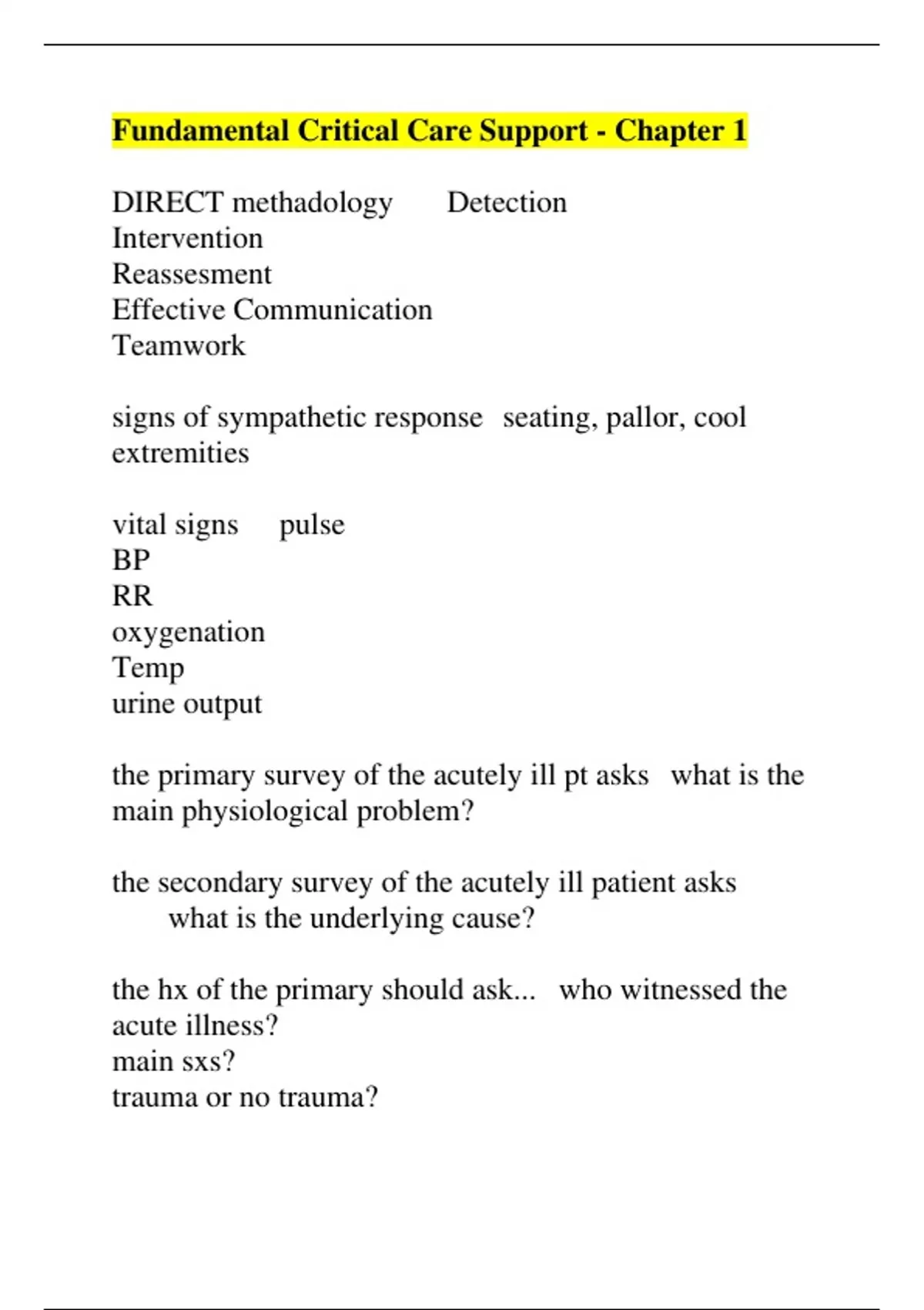 DIRECT methadology Detection Intervention Reassesment Effective Communication Teamwork signs of sympathetic response seating, pallor, cool extremities vital signs pulse BP RR oxygenation Temp urine output the primary survey of the acutely ill pt asks what is the main physiological problem? the secondary survey of the acutely ill patient asks what is the underlying cause? the hx of the primary should ask... who witnessed the acute illness? main sxs? trauma or no trauma?