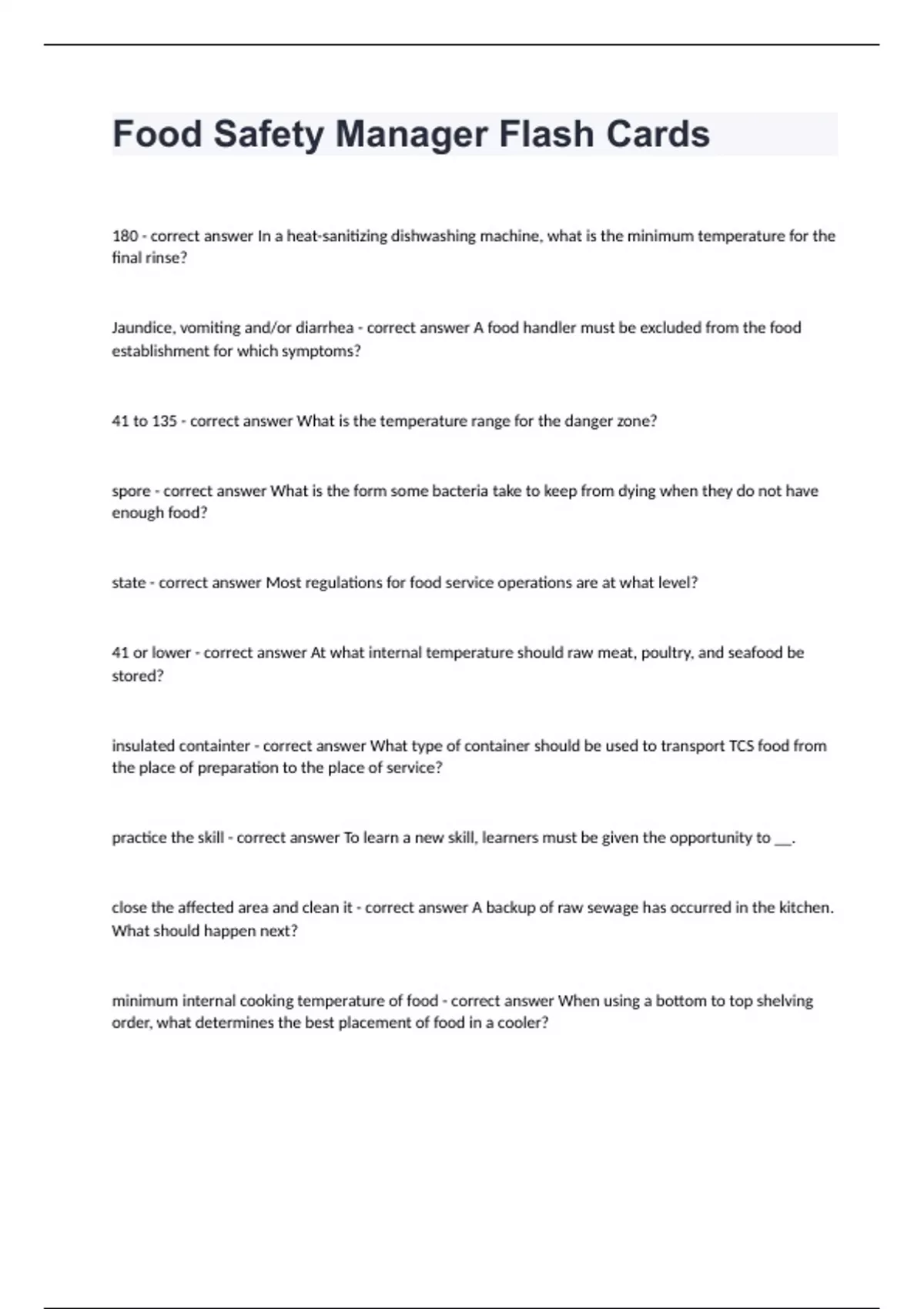 Food Safety Manager Flash Cards questions and answers already passed 2024
