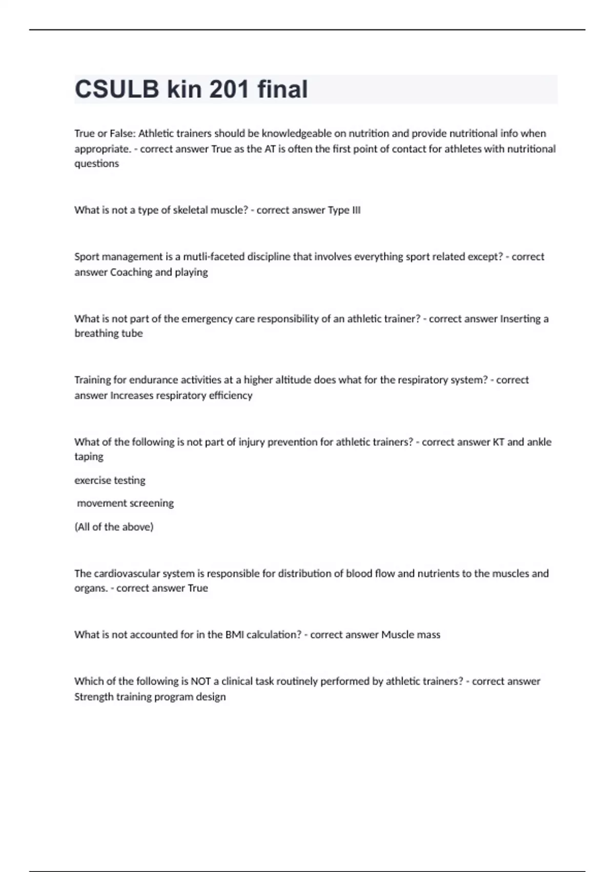 CSULB kin 201 final questions with complete solutions 2024