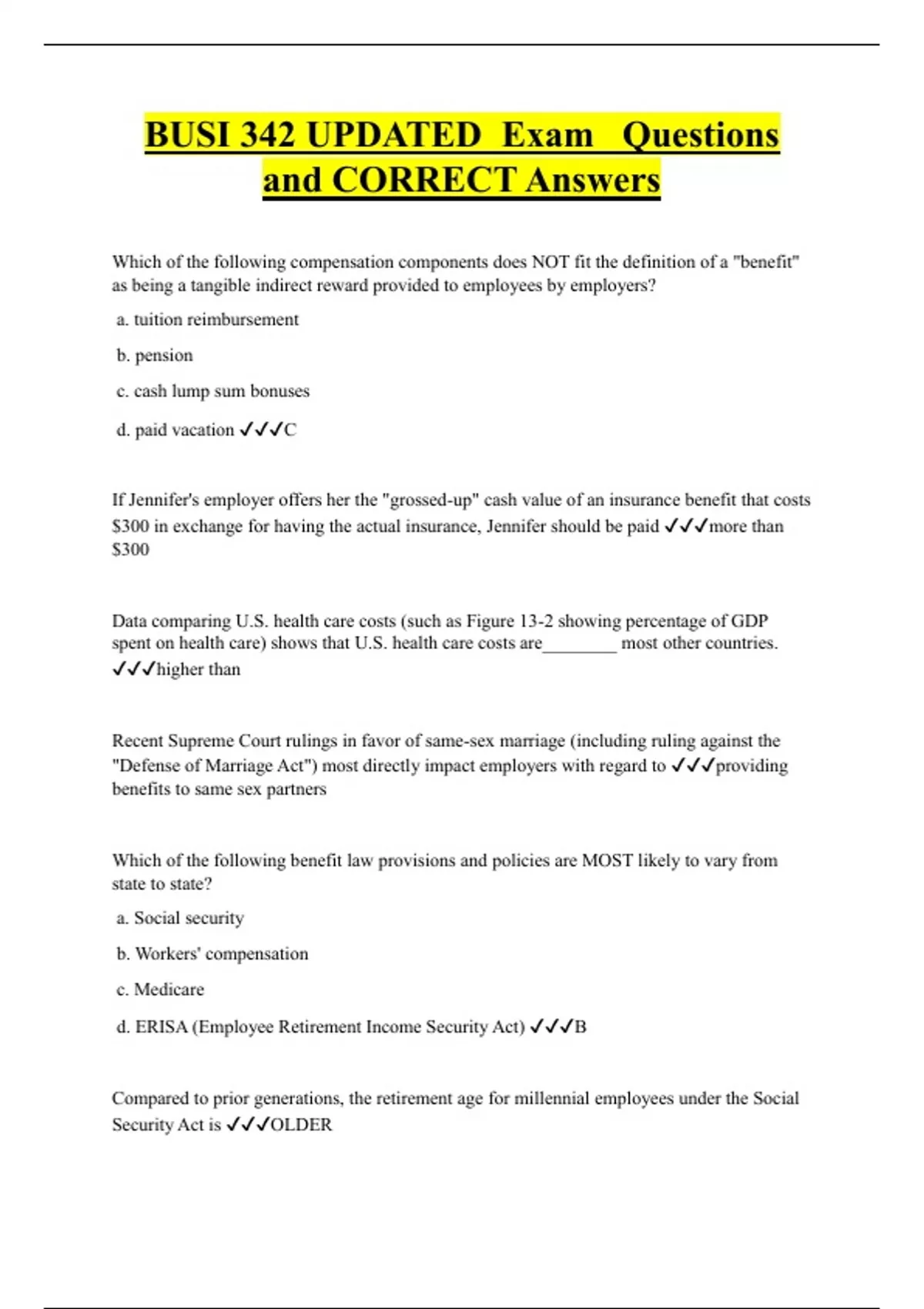 Which of the following compensation components does NOT fit the definition of a "benefit" as being a tangible indirect reward provided to employees by employers? a. tuition reimbursement b. pension c. cash lump sum bonuses d. paid vacation C If Jennifer's employer offers her the "grossed-up" cash value of an insurance benefit that costs $300 in exchange for having the actual insurance, Jennifer should be paid more than $300 Data comparing U.S. health care costs (such as Figure 13-2 showing percentage of GDP spent on health care) shows that U.S. health care costs are________ most other countries. higher than Recent Supreme Court rulings in favor of same-sex marriage (including ruling against the "Defense of Marriage Act") most directly impact employers with regard to providing benefits to same sex partner