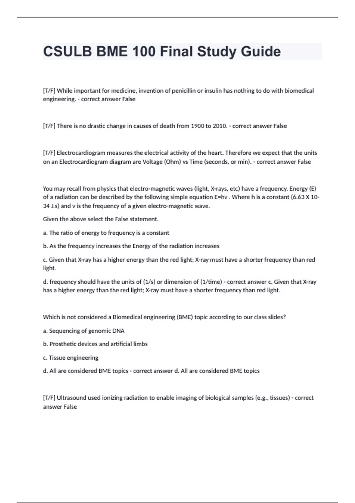 CSULB BME 100 Final Study Guide questions with complete solutions 2024
