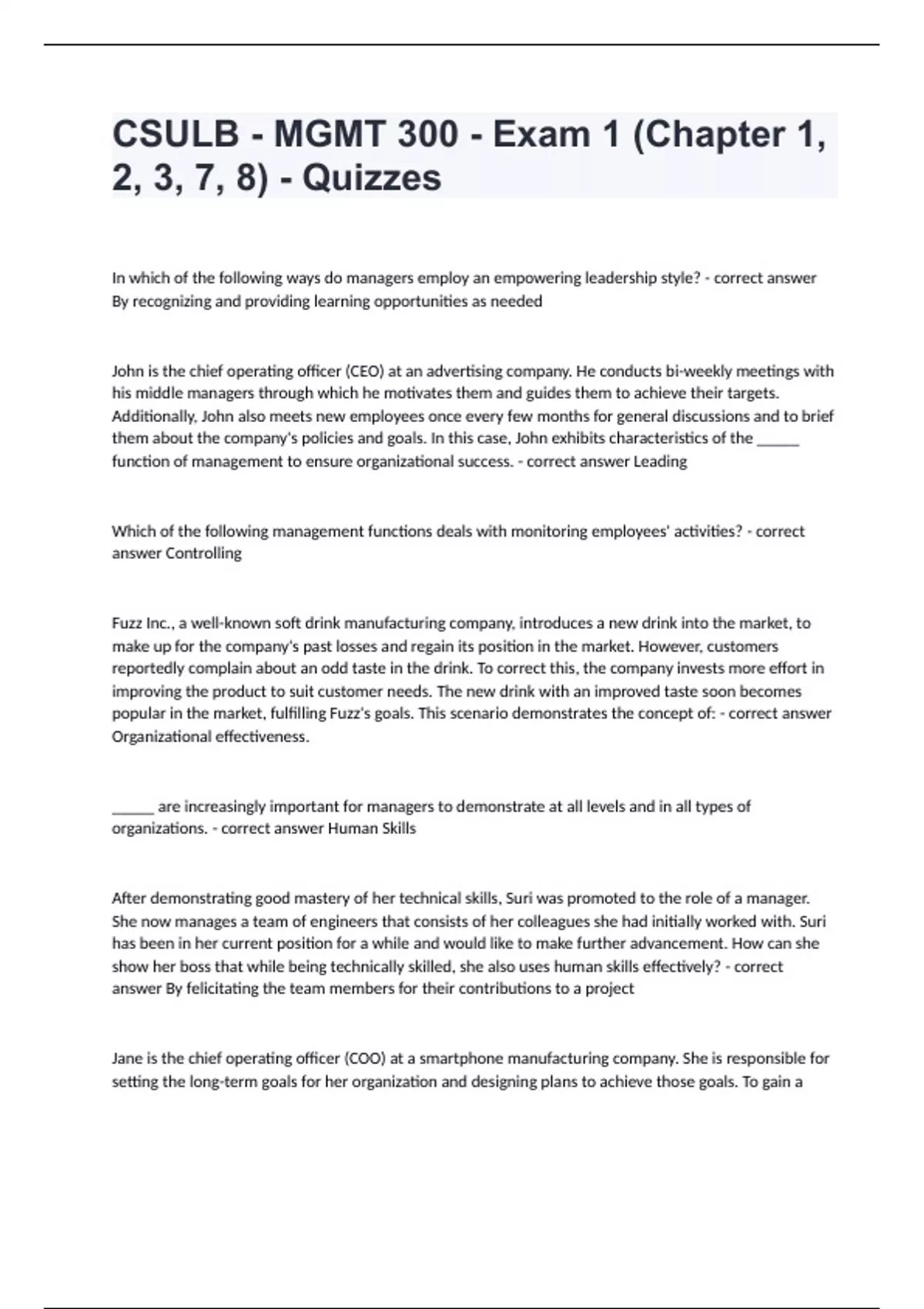 CSULB - MGMT 300 - Exam 1 (Chapter 1, 2, 3, 7, 8) - Quizzes. questions and answers certified 2024