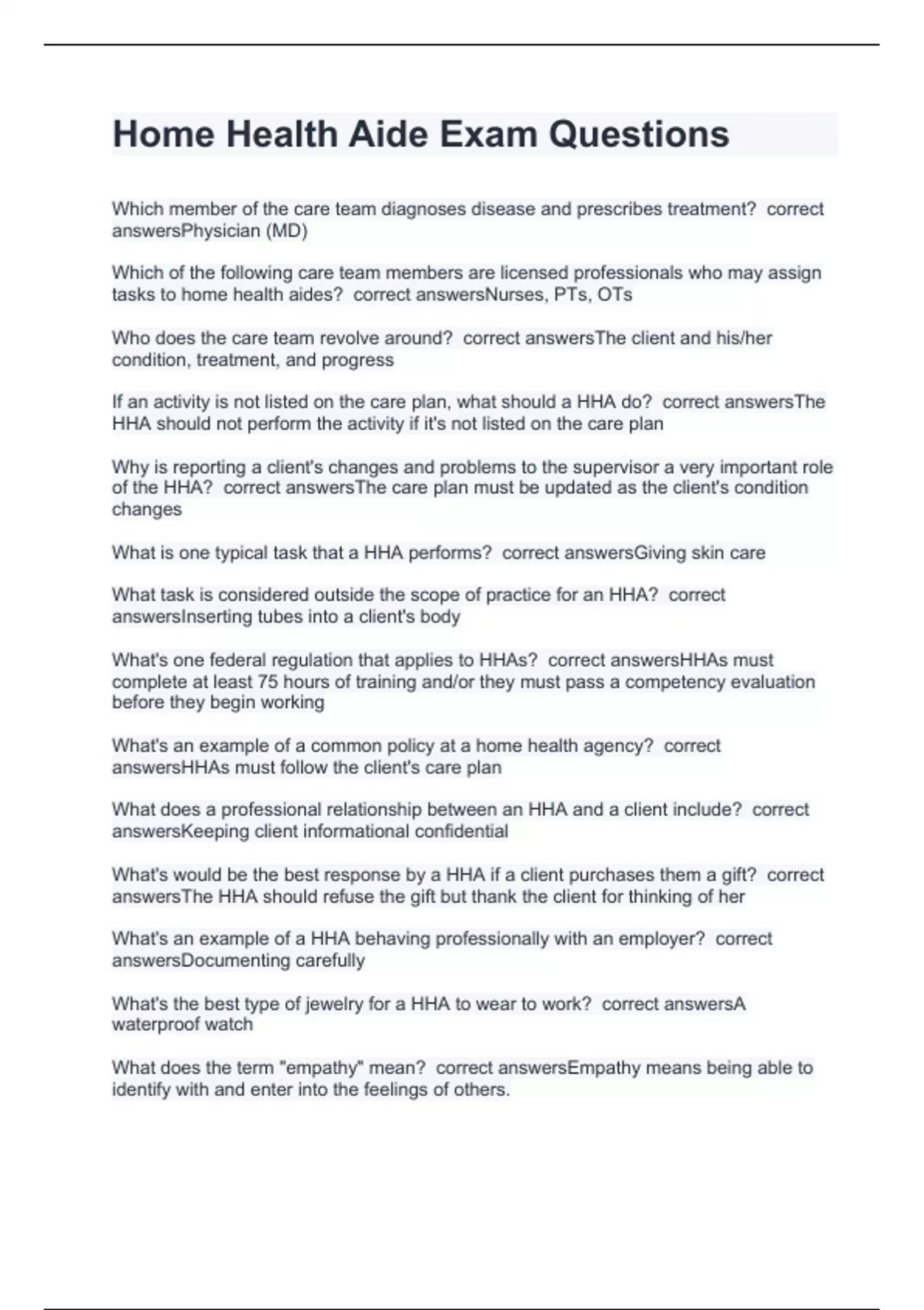 Which member of the care team diagnoses disease and prescribes treatment? correct answersPhysician (MD) Which of the following care team members are licensed professionals who may assign tasks to home health aides? correct answersNurses, PTs, OTs Who does the care team revolve around? correct answersThe client and his/her condition, treatment, and progress If an activity is not listed on the care plan, what should a HHA do? correct answersThe HHA should not perform the activity if it's not listed on the care plan Why is reporting a client's changes and problems to the supervisor a very important role of the HHA? correct answersThe care plan must be updated as the client's condition changes What is one typical task that a HHA performs? correct answersGiving skin care What task is considered outside the scope of practice for an HHA? correct answersInserting tubes into a client's body What's one federal regulation that applies to HHAs? correct answersHHAs must complete at least 75 hours of training and/or they must pass a competency evaluation before they begin working What's an example of a common policy at a home health agency? correct answersHHAs must follow the client's care plan What does a professional relationship between an HHA and a client include? correct answersKeeping client informational confidential What's would be the best response by a HHA if a client purchases them a gift? correct answersThe HHA should refuse the gift but thank the client for thinking of her What's an example of a HHA behaving professionally with an employer? correct answersDocumenting carefully What's the best type of jewelry for a HHA to wear to work? correct answersA waterproof watch What does the term "empathy" mean? correct answersEmpathy means being able to identify with and enter into the feelings of others.