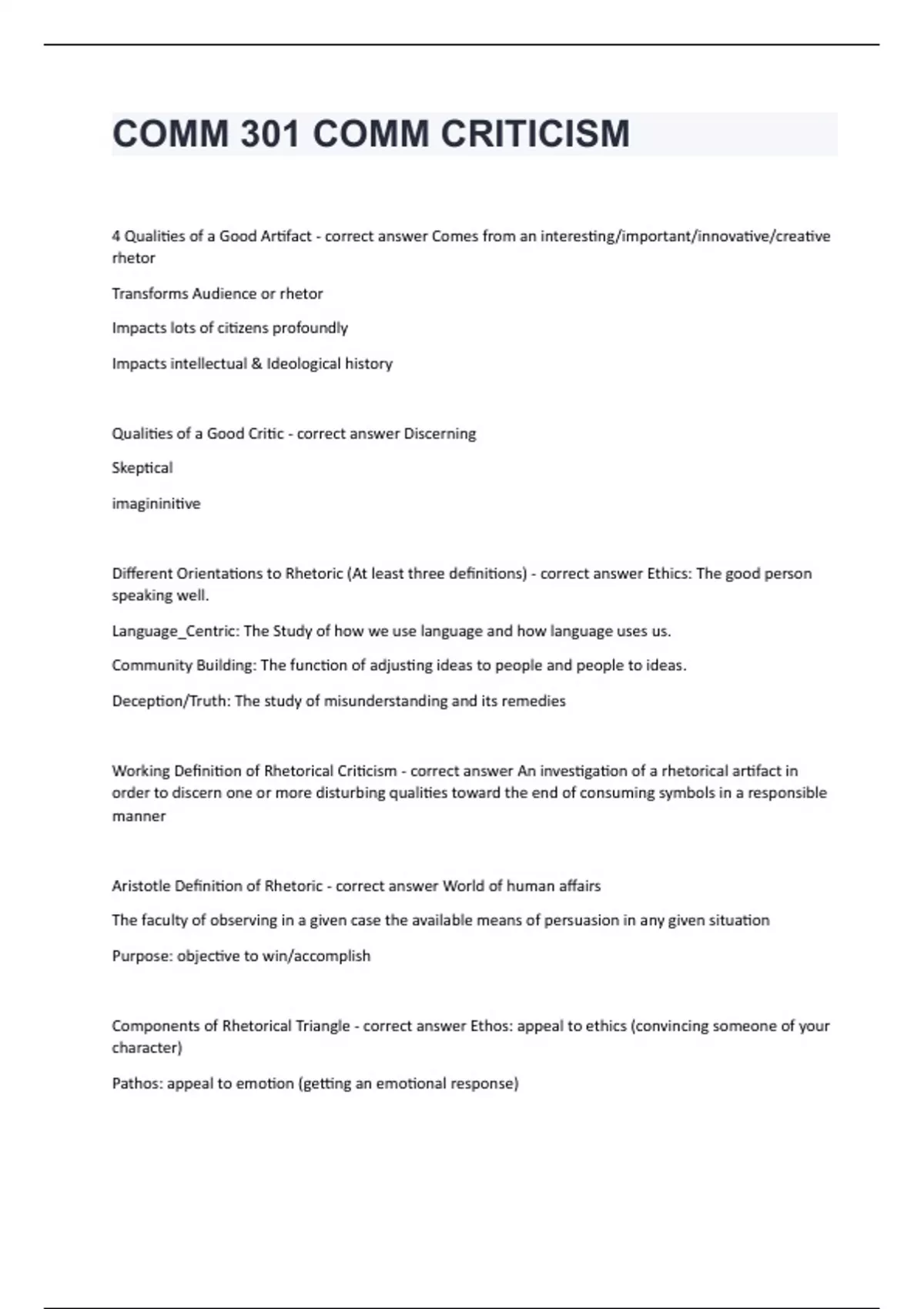 COMM 301 COMM CRITICISM questions and answers verified 2024