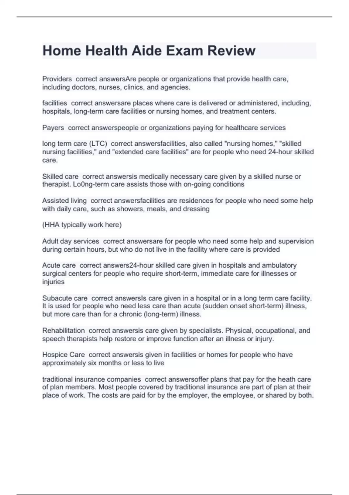 Providers correct answersAre people or organizations that provide health care, including doctors, nurses, clinics, and agencies. facilities correct answersare places where care is delivered or administered, including, hospitals, long-term care facilities or nursing homes, and treatment centers. Payers correct answerspeople or organizations paying for healthcare services long term care (LTC) correct answersfacilities, also called "nursing homes," "skilled nursing facilities," and "extended care facilities" are for people who need 24-hour skilled care. Skilled care correct answersis medically necessary care given by a skilled nurse or therapist. Lo0ng-term care assists those with on-going conditions Assisted living correct answersfacilities are residences for people who need some help with daily care, such as showers, meals, and dressing (HHA typically work here) Adult day services correct answersare for people who need some help and supervision during certain hours, but who do not live in the facility where care is provided Acute care correct answers24-hour skilled care given in hospitals and ambulatory surgical centers for people who require short-term, immediate care for illnesses or injuries Subacute care correct answersIs care given in a hospital or in a long term care facility. It is used for people who need less care than acute (sudden onset short-term) illness, but more care than for a chronic (long-term) illness. Rehabilitation correct answersis care given by specialists. Physical, occupational, and speech therapists help restore or improve function after an illness or injury. Hospice Care correct answersis given in facilities or homes for people who have approximately six months or less to live traditional insurance companies correct answersoffer plans that pay for the heath care of plan members. Most people covered by traditional insurance are part of plan at their place of work. The costs are paid for by the employer, the employee, or shared by both.