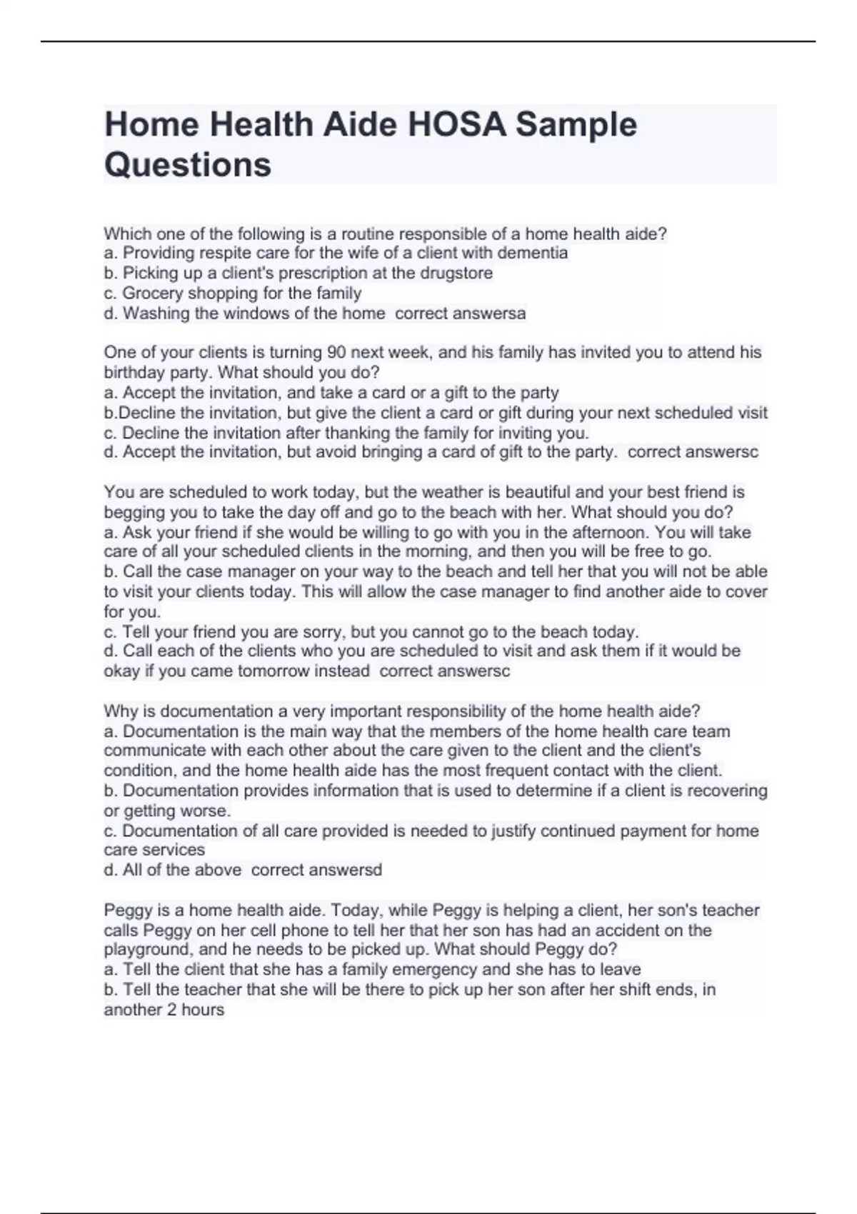 Which one of the following is a routine responsible of a home health aide? a. Providing respite care for the wife of a client with dementia b. Picking up a client's prescription at the drugstore c. Grocery shopping for the family d. Washing the windows of the home correct answersa One of your clients is turning 90 next week, and his family has invited you to attend his birthday party. What should you do? a. Accept the invitation, and take a card or a gift to the party b.Decline the invitation, but give the client a card or gift during your next scheduled visit c. Decline the invitation after thanking the family for inviting you. d. Accept the invitation, but avoid bringing a card of gift to the party. correct answersc You are scheduled to work today, but the weather is beautiful and your best friend is begging you to take the day off and go to the beach with her. What should you do? a. Ask your friend if she would be willing to go with you in the afternoon. You will take care of all your scheduled clients in the morning, and then you will be free to go. b. Call the case manager on your way to the beach and tell her that you will not be able to visit your clients today. This will allow the case manager to find another aide to cover for you. c. Tell your friend you are sorry, but you cannot go to the beach today. d. Call each of the clients who you are scheduled to visit and ask them if it would be okay if you came tomorrow instead correct answersc Why is documentation a very important responsibility of the home health aide? a. Documentation is the main way that the members of the home health care team communicate with each other about the care given to the client and the client's condition, and the home health aide has the most frequent contact with the client. b. Documentation provides information that is used to determine if a client is recovering or getting worse. c. Documentation of all care provided is needed to justify continued payment for home care services d. All of the above correct answersd Peggy is a home health aide. Today, while Peggy is helping a client, her son's teacher calls Peggy on her cell phone to tell her that her son has had an accident on the playground, and he needs to be picked up. What should Peggy do? a. Tell the client that she has a family emergency and she has to leave b. Tell the teacher that she will be there to pick up her son after her shift ends, in another 2 hours