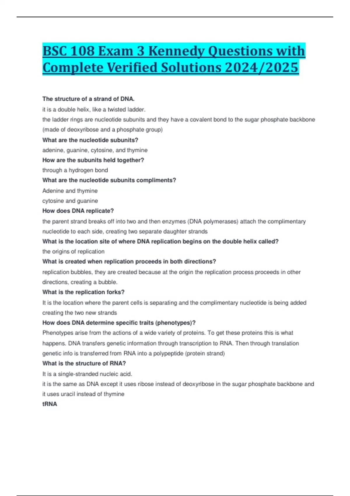 BSC 108 Exam 3 Kennedy Questions with Complete Verified Solutions 2024/2025