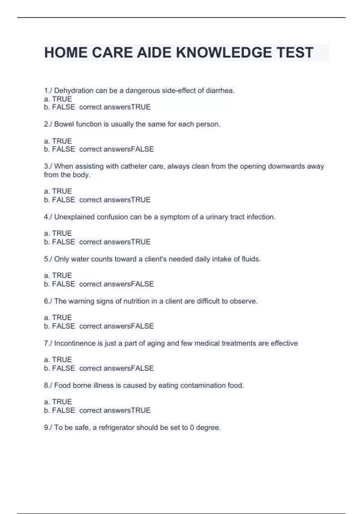 1./ Dehydration can be a dangerous side-effect of diarrhea. a. TRUE b. FALSE correct answersTRUE 2./ Bowel function is usually the same for each person. a. TRUE b. FALSE correct answersFALSE 3./ When assisting with catheter care, always clean from the opening downwards away from the body. a. TRUE b. FALSE correct answersTRUE 4./ Unexplained confusion can be a symptom of a urinary tract infection. a. TRUE b. FALSE correct answersTRUE 5./ Only water counts toward a client's needed daily intake of fluids. a. TRUE b. FALSE correct answersFALSE 6./ The warning signs of nutrition in a client are difficult to observe. a. TRUE b. FALSE correct answersFALSE 7./ Incontinence is just a part of aging and few medical treatments are effective a. TRUE b. FALSE correct answersFALSE 8./ Food borne illness is caused by eating contamination food. a. TRUE b. FALSE correct answersTRUE 9./ To be safe, a refrigerator should be set to 0 degree
