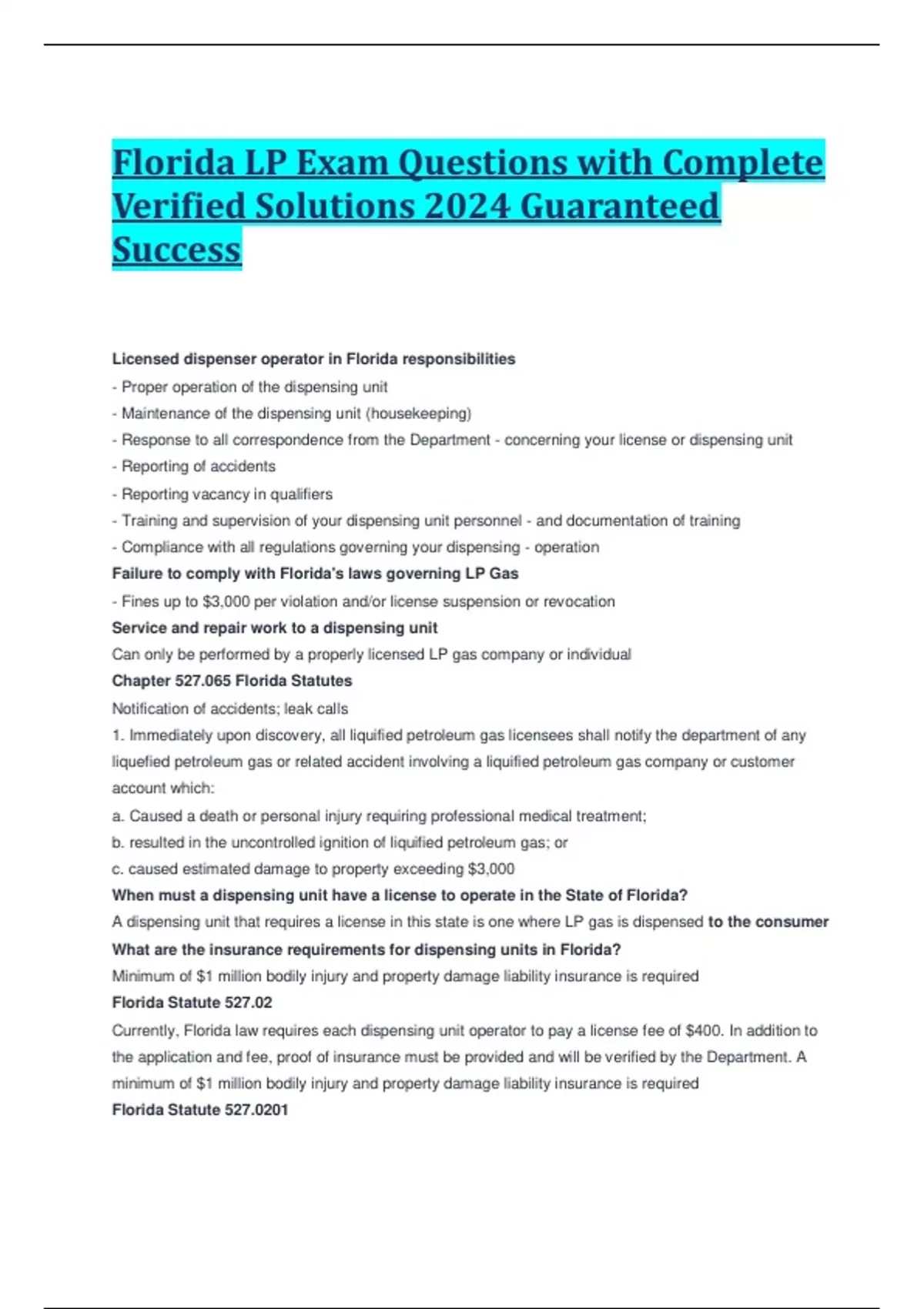 Florida LP Exam Questions with Complete Verified Solutions 2024 Guaranteed Success Licensed dispenser operator in Florida responsibilities - Proper operation of the dispensing unit - Maintenance of the dispensing unit (housekeeping) - Response to all correspondence from the Department - concerning your license or dispensing unit - Reporting of accidents - Reporting vacancy in qualifiers - Training and supervision of your dispensing unit personnel - and documentation of training - Compliance with all re gulations governing your dispensing - operation Failure to comply with Florida's laws governing LP Gas - Fines up to $3,000 per violation and/or license suspension or revocation Service and repair work to a dispensing unit Can only be performed by a proper ly licensed LP gas company or individual Chapter 527.065 Florida Statutes Notification of accidents; leak calls 1. Immediately upon discovery, all liquified petroleum gas licensees shall notify the department of any liquefied petroleum gas or related accid ent involving a liquified petroleum gas company or customer account which: a. Caused a death or personal injury requiring professional medical treatment; b. resulted in the uncontrolled ignition of liquified petroleum gas; or c. caused estimated damage to property exceeding $3,000 When must a dispensing unit have a license to operate in the State of Florida? A dispensing unit that requires a license in this state is one where LP gas is dispensed to the consumer What are the insurance requirements for dispen sing units in Florida? Minimum of $1 million bodily injury and property damage liability insurance is required Florida Statute 527.02 Currently, Florida law requires each dispensing unit operator to pay a license fee of $400. In addition to the application and fee, proof of insurance must be provided and will be verified by the Department. A minimum of $1 million bodily injury and property damage liability insurance is required Florida Statute 527.0201 Each dispensing unit operator must employ one " qualifier ". A qualifier is an individual who has successfully completed an examination administered by the Department. The qualifier registration received as a result of passing the exam is not a license. LP Qualifier registration expiration time 3 years a fter the date of issuance How many locations can a qualifier serve? One Florida Statute 527.0605 No dispenser may be put into service without Department approval When must accidents be reported? Immediately What is a qualifier? An individual who has successfully completed an examination administered by the Department. Who oversees the sale of LP gas in Florida? The Florida Department of Agriculture and Division of Consumer Services License category for dispensing units Category II Liquified Petroleum Gas Dispenser Who is allowed to dispense LP gas in Florida A licensed dispenser operator Who is responsible for the safe operation of your dispensing unit? The licensed dispenser operator Who is allowed, by law, to repair leaks and replace parts on your di spensing unit? A properly licensed LP gas company or individual What penalties may be levied by the Florida Department of Agriculture & Consumer Services for violations of Florida's LP gas laws? Fines up to $3,000 per violation and/or license suspension or revocation What is propane? Propane, LP gas, bottled gas, and propylene are some of the names used to identify liquified petroleum gas. LP gases are in the family of hydrocarbons , but not all hydrocarbons are LP gases. Propane properties in its natural st ate Colorless, odorless, tasteless, and non -toxic Odorant most commonly added to propane Ethyl Mercaptan What does Ethyl Mercaptan do? When added to propane, it serves as a warning agent of a possible gas leak How many times will liquid propane expand as i t changes to a vapor state? 270 Times Expansion ratio of liquid propane to vapor state 270:1 Propane boils at what temperature? 44 degrees below zero ( -44F) First aid treatment for contact with liquid propane? Lukewarm water to the affected area What is specific gravity? Weight of a product compared to the weight of water or air What is the specific gravity of propane vapor ? 1.50 What is the specific gravity of air versus propane vapor? 1 to 1.50 Which weighs more, air or propane vapor? And by how much? Propane vapor. One and one half times more What is the specific gravity of propane liquid? .504 What is the specific gravity of water? 1 Which is lighter, water or liquid propane? And what is the ratio between them? Liquid propane. .504 -1 Describe what will happen knowing that vapor propane is heavier than air It will normally seek out low areas, but this behavior can be affected by air currents. What hazard is created due to propane being heavier than air? Simple asphyxiates True or false: Oxygen needed to sustain life can be displaced by propane? True Inhaling vapor causes what symptoms Dizziness, unconsciousness, and respiratory arrest Potential affects of Oxygen -deficient atmospheres at 19.05% by volume Minimum permissible oxygen level Potential affects of Oxygen -deficient atmospheres at 15-19% by volume Decreased ability to work strenuously. May impair coordination and may induce early symptoms in persons with coronary, pulmonary, or circulatory problems. Potential affects of Oxygen -deficient atmosphere s at 12-14% by volume Respiration increases in exertion, pulse up, impaired coordination, perception, judgement. Potential affects of Oxygen -deficient atmospheres at 10-12% by volume Respiration further increases in rate and depth, poor judgement, lips blu e.