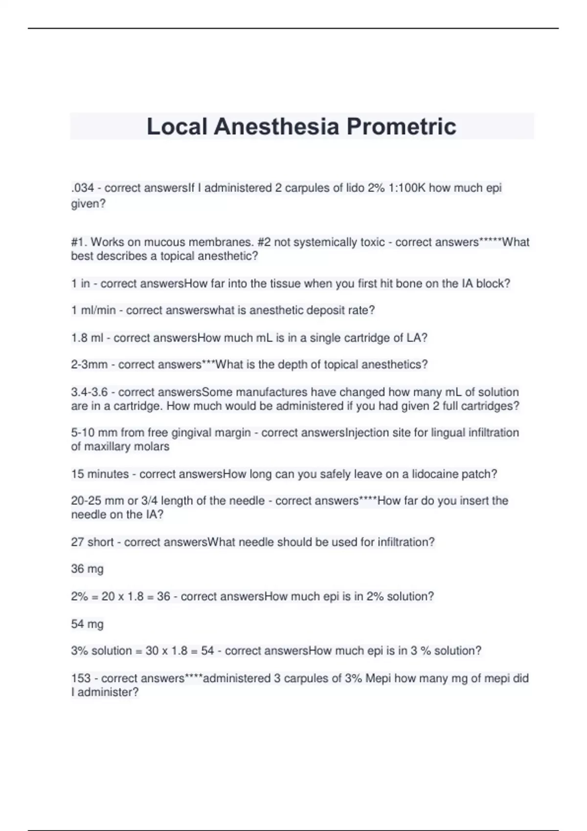 Local Anesthesia Prometric .034 - correct answersIf I administered 2 carpules of lido 2% 1:100K how much epi given? #1. Works on mucous membranes. #2 not systemically toxic - correct answers*****What best describes a topical anesthetic? 1 in - correct answersHow far into the tissue when you first hit bone on the IA block? 1 ml/min - correct answerswhat is anesthetic deposit rate? 1.8 ml - correct answersHow much mL is in a single cartridge of LA? 2-3mm - correct answers***What is the depth of topical anesthetics? 3.4-3.6 - correct answersSome manufactures have changed how many mL of solution are in a cartridge. How much would be administered if you had given 2 full cartridges? 5-10 mm from free gingival margin - correct answersInjection site for lingual infiltration of maxillary molars 15 minutes - correct answersHow long can you safely leave on a lidocaine patch? 20-25 mm or 3/4 length of the needle - correct answers****How far do you insert the needle on the IA? 27 short - correct answersWhat needle should be used for infiltration? 36 mg 2% = 20 x 1.8 = 36 - correct answersHow much epi is in 2% solution? 54 mg 3% solution = 30 x 1.8 = 54 - correct answersHo