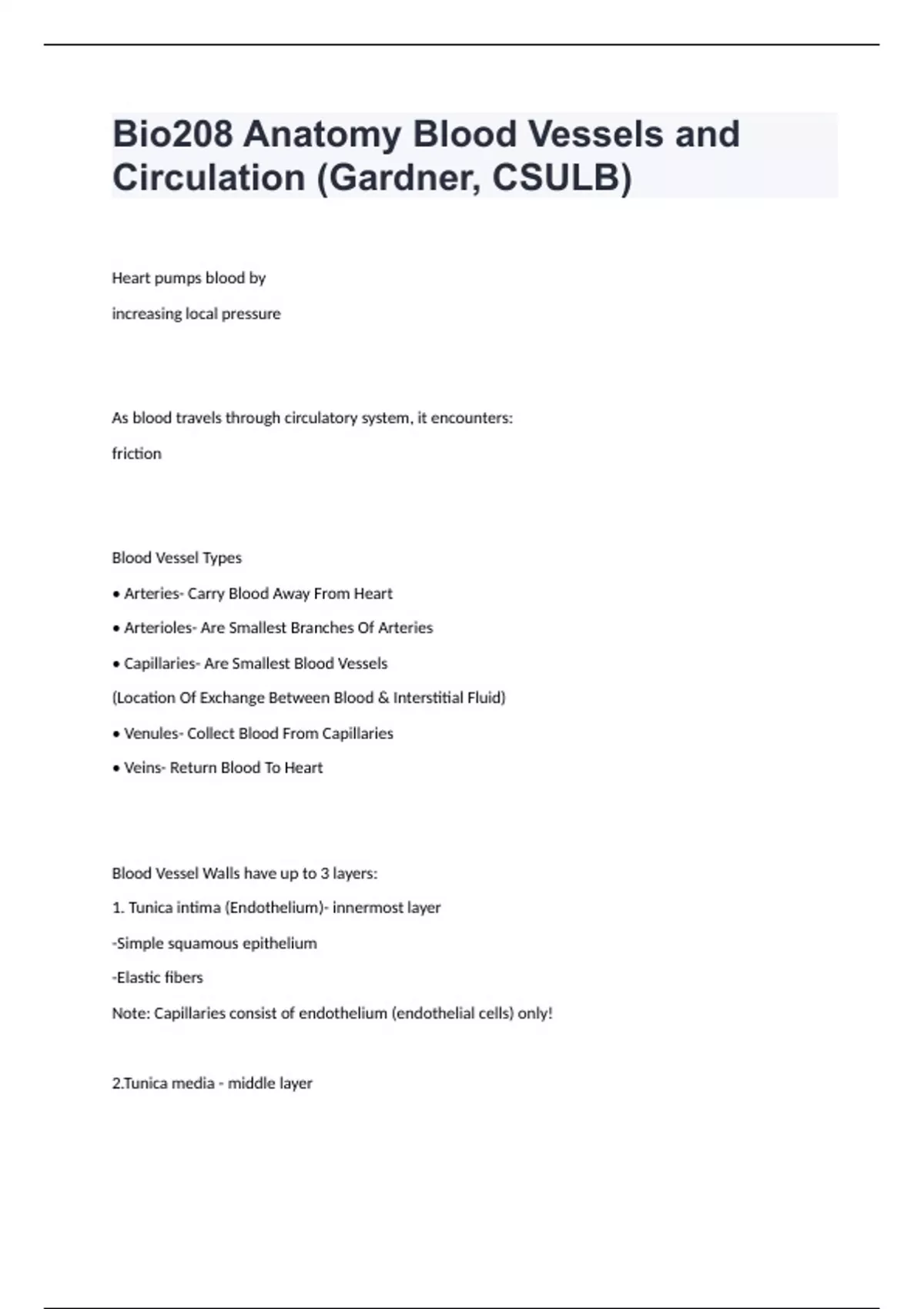 Bio208 Anatomy Blood Vessels and Circulation (Gardner, CSULB) questions and answers verified 2024