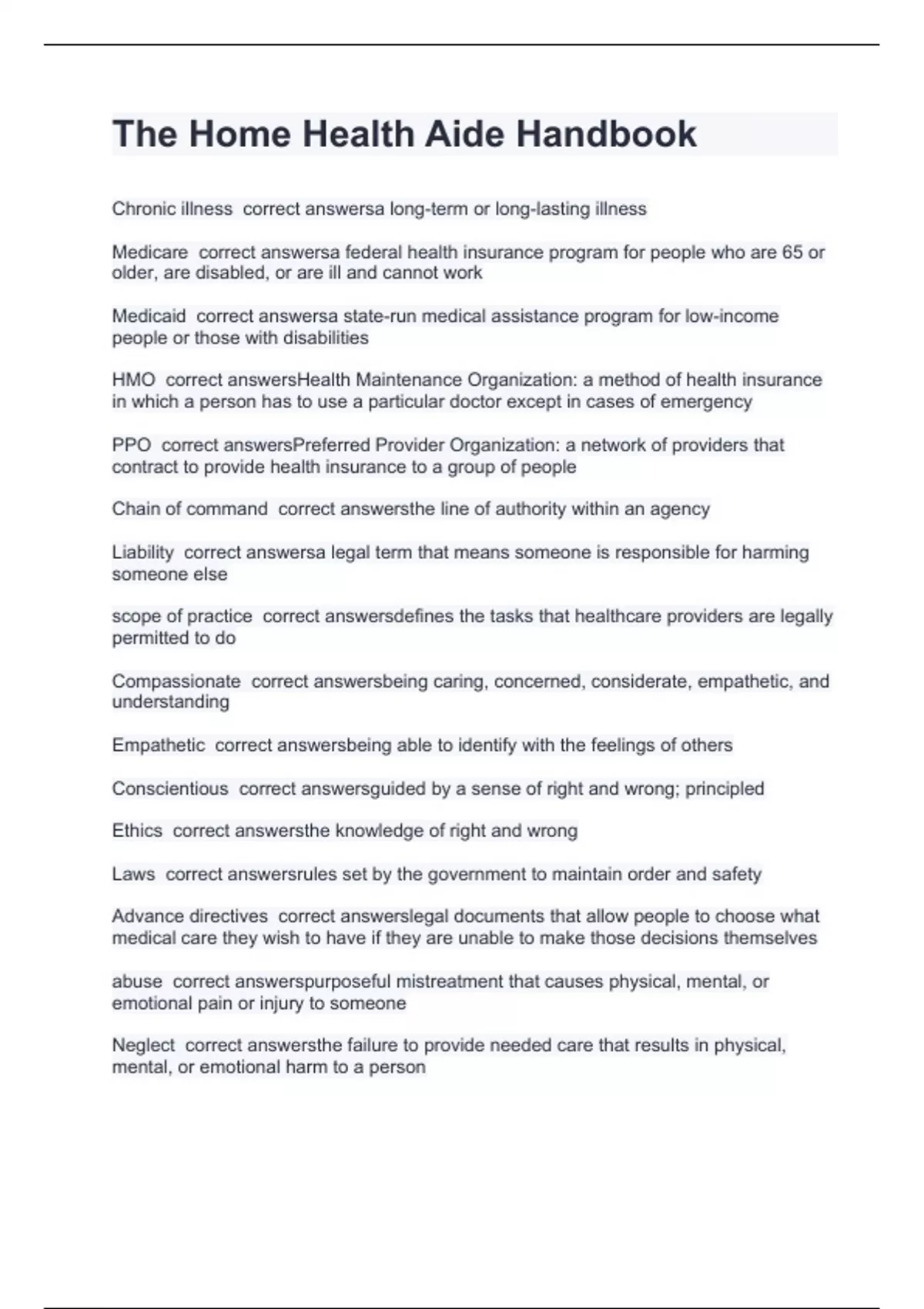 Chronic illness correct answersa long-term or long-lasting illness Medicare correct answersa federal health insurance program for people who are 65 or older, are disabled, or are ill and cannot work Medicaid correct answersa state-run medical assistance program for low-income people or those with disabilities HMO correct answersHealth Maintenance Organization: a method of health insurance in which a person has to use a particular doctor except in cases of emergency PPO correct answersPreferred Provider Organization: a network of providers that contract to provide health insurance to a group of people Chain of command correct answersthe line of authority within an agency Liability correct answersa legal term that means someone is responsible for harming someone else scope of practice correct answersdefines the tasks that healthcare providers are legally permitted to do Compassionate correct answersbeing caring, concerned, considerate, empathetic, and understanding Empathetic correct answersbeing able to identify with the feelings of others Conscientious correct answersguided by a sense of right and wrong; principled Ethics correct answersthe knowledge of right and wrong Laws correct answersrules set by the government to maintain order and safety Advance directives correct answerslegal documents that allow people to choose what medical care they wish to have if they are unable to make those decisions themselves abuse correct answerspurposeful mistreatment that causes physical, mental, or emotional pain or injury to someone Neglect correct answersthe failure to provide needed care that results in physical, mental, or emotional harm to a person