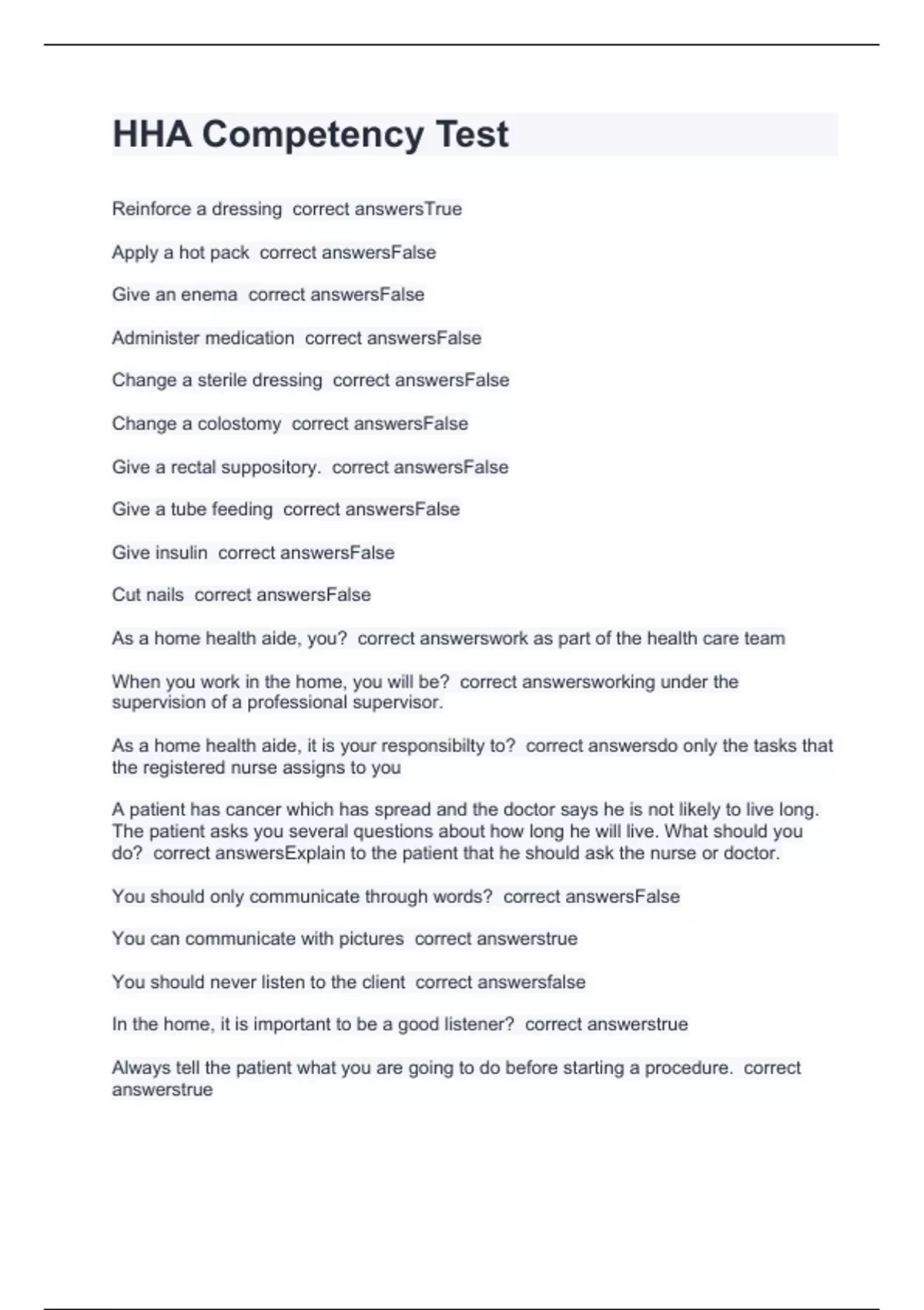 Reinforce a dressing correct answersTrue Apply a hot pack correct answersFalse Give an enema correct answersFalse Administer medication correct answersFalse Change a sterile dressing correct answersFalse Change a colostomy correct answersFalse Give a rectal suppository. correct answersFalse Give a tube feeding correct answersFalse Give insulin correct answersFalse Cut nails correct answersFalse As a home health aide, you? correct answerswork as part of the health care team When you work in the home, you will be? correct answersworking under the supervision of a professional supervisor. As a home health aide, it is your responsibilty to? correct answersdo only the tasks that the registered nurse assigns to you A patient has cancer which has spread and the doctor says he is not likely to live long. The patient asks you several questions about how long he will live. What should you do? correct answersExplain to the patient that he should ask the nurse or doctor. You should only communicate through words? correct answersFalse You can communicate with pictures correct answerstrue You should never listen to the client correct answersfalse In the home, it is important to be a good listener? correct answerstrue Always tell the patient what you are going to do before starting a procedure. correct answerstrue