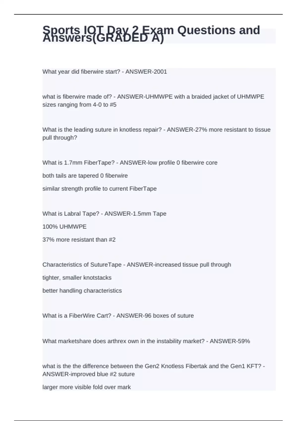 What year did fiberwire start? - ANSWER-2001 what is fiberwire made of? - ANSWER-UHMWPE with a braided jacket of UHMWPE sizes ranging from 4-0 to #5 What is the leading suture in knotless repair? - ANSWER-27% more resistant to tissue pull through? What is 1.7mm FiberTape? - ANSWER-low profile 0 fiberwire core both tails are tapered 0 fiberwire similar strength profile to current FiberTape What is Labral Tape? - ANSWER-1.5mm Tape 100% UHMWPE 37% more resistant than #2 Characteristics of SutureTape - ANSWER-increased tissue pull through tighter, smaller knotstacks better handling characteristics What is a FiberWire Cart? - ANSWER-96 boxes of suture What marketshare does arthrex own in the instability market? - ANSWER-59% what is the the difference between the Gen2 Knotless Fibertak and the Gen1 KFT? - ANSWER-improved blue #2 suture larger more visible fold over mark take an average of 30 min per implant of processing time What straight drill guide is in the 1.8 and 1.6 perc kit - ANSWER-fishmouth What is the benefit of the rotation lasso? - ANSWER-all inside suture lasso reduces procedural steps 90 degree 2mm tip fits down a 7mm cannula has to be a 2 portal technique